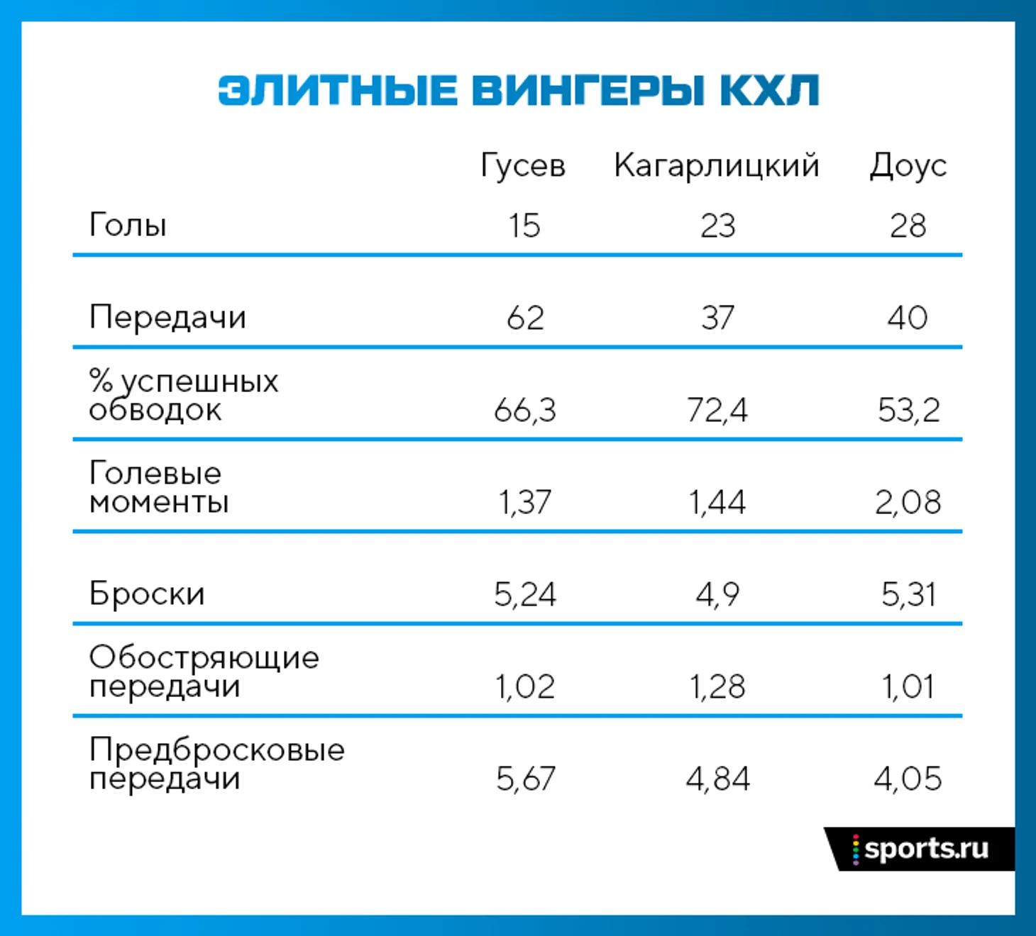 Он не хуже Гусева в плане генерации моментов в чужой зоне, а Найджелу Доусу не уступает в плане снайперских навыков – 23 шайбы у динамовца против 28 у Доуса. Отдельно стоит отметить и процент успешных обводок: в схватках один на один Кагарлицкий один из лучших форвардов лиги, он настоящий кошмар для защитников.