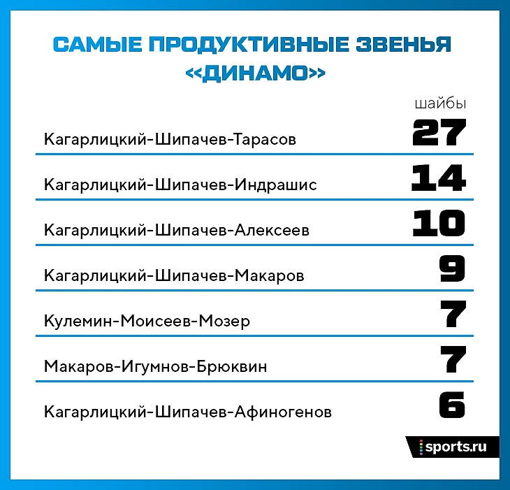 Такое ощущение, что два бывших лидера «Северстали» всю жизнь играли вместе. Кагарлицкий – реактивный край с правым хватом, который легко уходит от любых защитников и может отрезками возить даже СКА. Шипачев – классический русский центр, который паршиво обороняется, слабо играет на точке, зато в чужой зоне просто убивает соперников своими передачами. Сложно сказать, где сейчас было бы «Динамо», если бы летом боссы не достали свой кошелек. Шипачев и Кагарлицкий на двоих уже собрали 127 очков и забросили 43 шайбы – это почти треть от общего числа голов «Динамо». Вот самые результативные тройки бело-голубых, и практически везде есть Кагарлицкий и Шипачев: