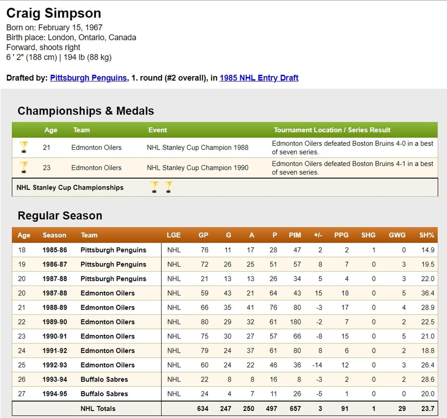 Остальные пусть даже и не пытаются отгадать ответ, проще выиграть в спортлото 6 из 49. Ведь числа от 1 до 49 все мы более-менее помним, как-то случайно можно и угадать, а такого игрока как Крейг Симпсон (247 шайб с 1044 бросков, 23.7%) большинство из нас ни в жизнь не вспомнит.