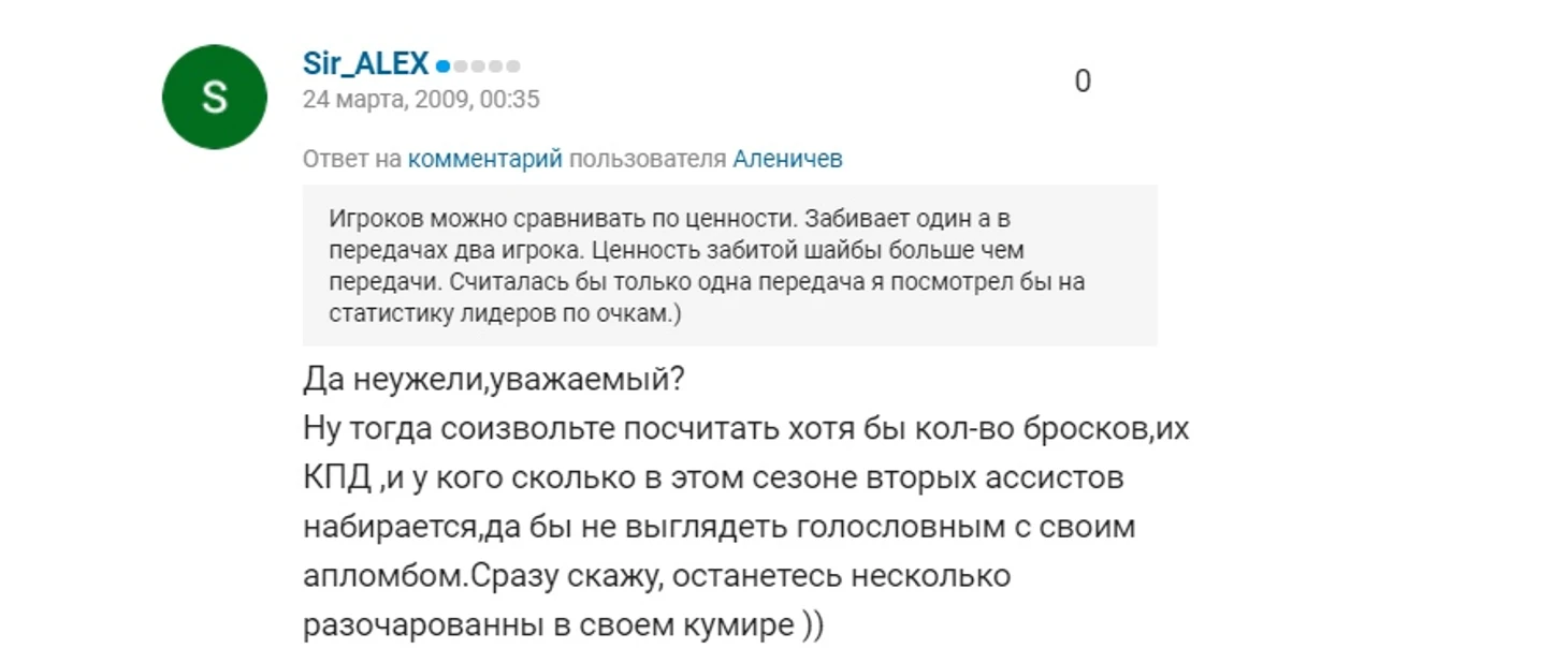 Нам говорят, что в 80-е годы Овечкин забивал бы даже меньше, чем сейчас, дескать, бросал бы он неудобной деревянной клюшкой. Но вот ведь какое дело. Обычный игрок средней руки в 80-е годы реализовывал на 40% бросков больше, чем сейчас. Это общая закономерность, которая по какой-то неизвестной причине не коснулась бы Овечкина. Почему??? Канфаны не ответят нам на этот вопрос. Это не клюшки деревянные. Это логика деревянная.