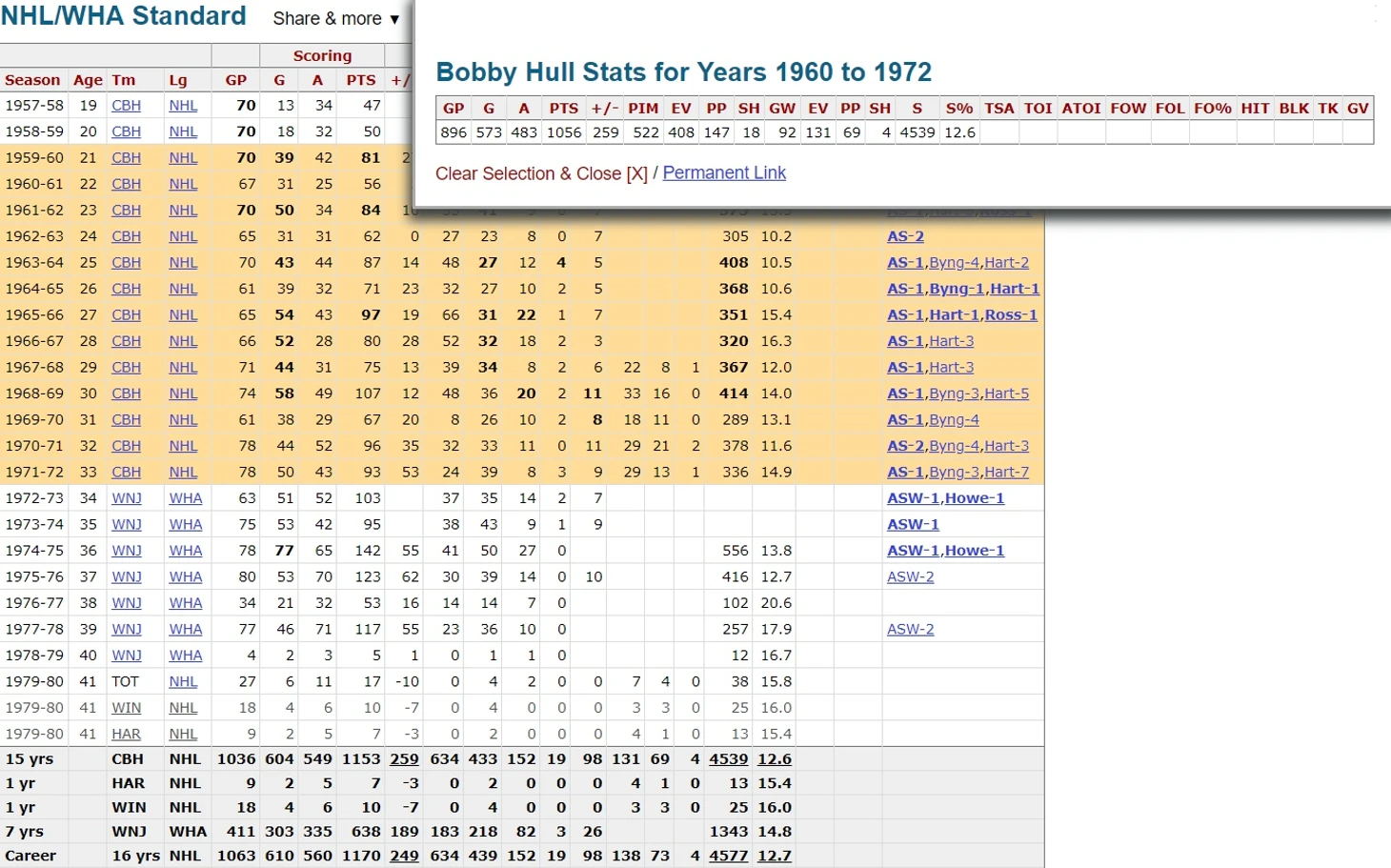 Для двух первых сезонов Халла в НХЛ статистика бросков отсутствует. Поэтому учитываем 13 сезонов, начиная с 1959-60 по 1971-72, после чего Халл перешёл в ВХА. Халл является лучшим снайпером этого исторического периода, причём с отрывом (1.Халл 573, 2. Маховлич 421). Он нанёс больше всех бросков, причём опять же с отрывом (1.Халл 4539, 2.Хоу 3709). При этом реализация составляет 12.6%. Ну вылитый Овечкин! Даже процент совпадает! Это и есть почерк Великих.