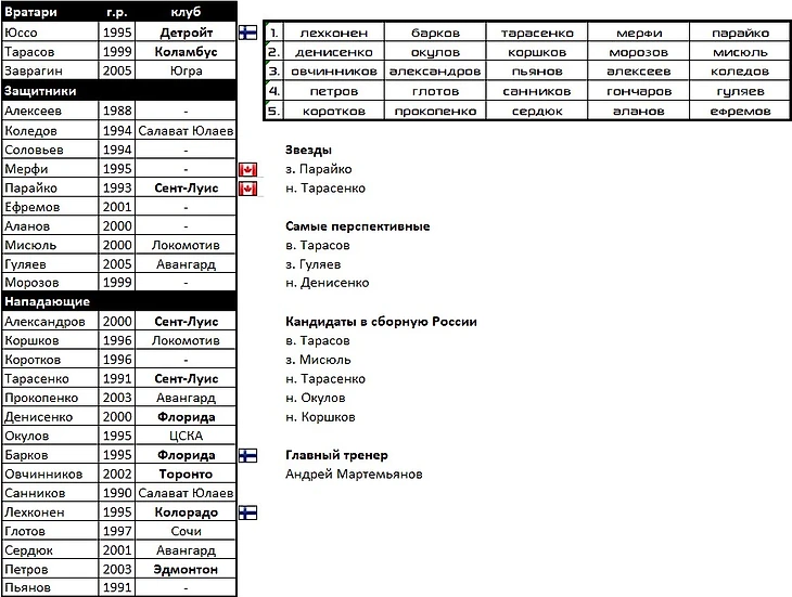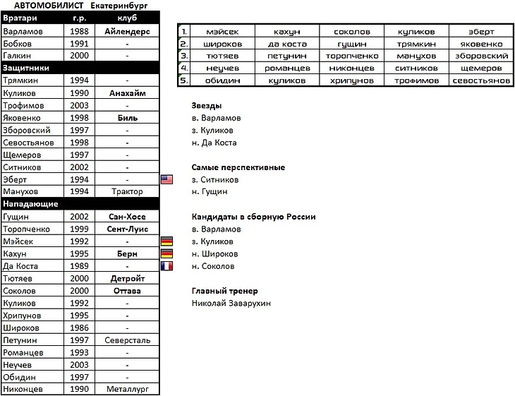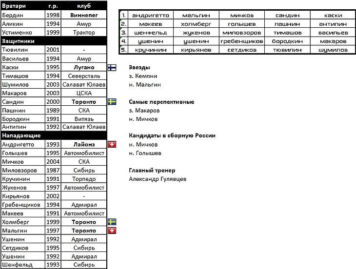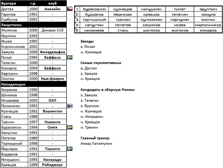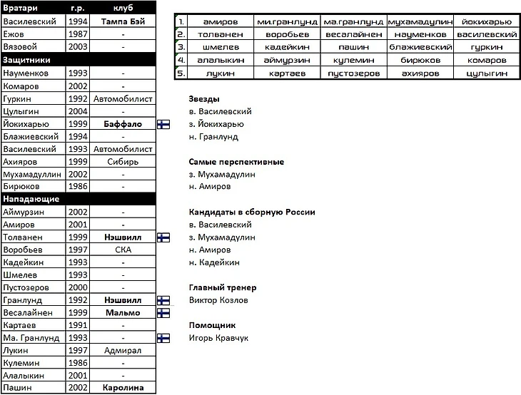 В составе, как и у "Лады", практически все воспитанники, кроме Кочеткова, Куликова, уральцев Галимова, Комарова, Зернова и Основина.На перезагрузку в КХЛ приезжают Юолеви, Мяяття, Фрк, Кубалик. Добавит таланта команде русскоязычный американец Пастухов.