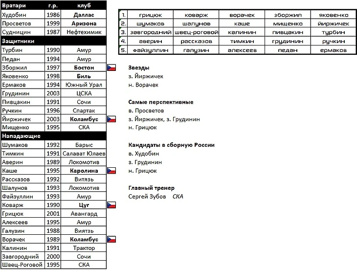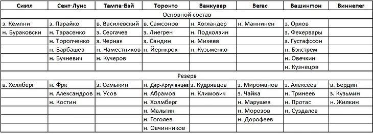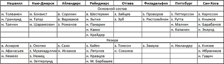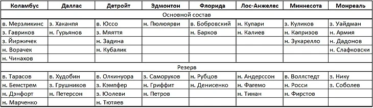 Итого у нас получилось 27 клубов. Откуда взять игроков на целых 5 команд, да еще и остальные клубы не мешало бы усилить. Конечно, из Северной Америки. Для начала вернем всех россиян. Лига получит крутых звезд. Средний уровень станет уже сильно выше. А значит и более качественных легионеров не только из Европы можно будет заманить в КХЛ. Так и сделаем.