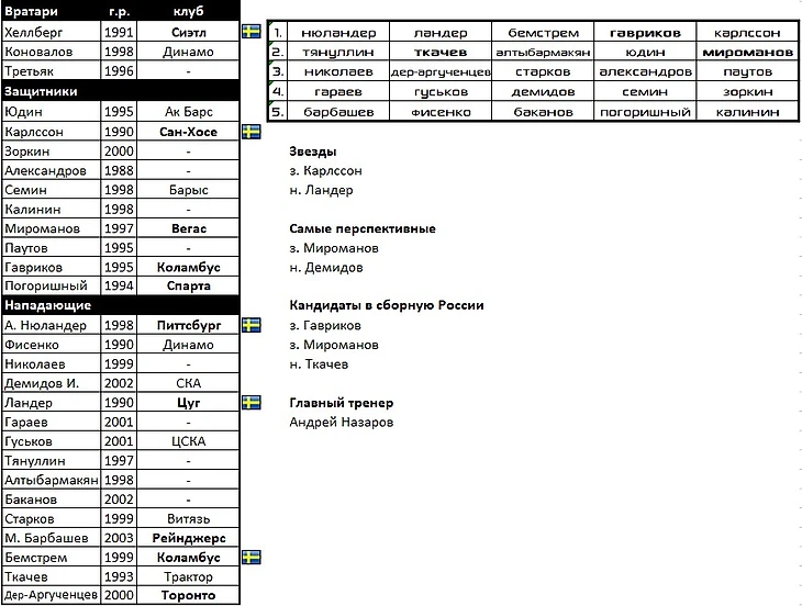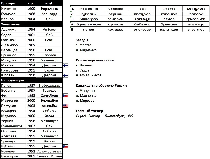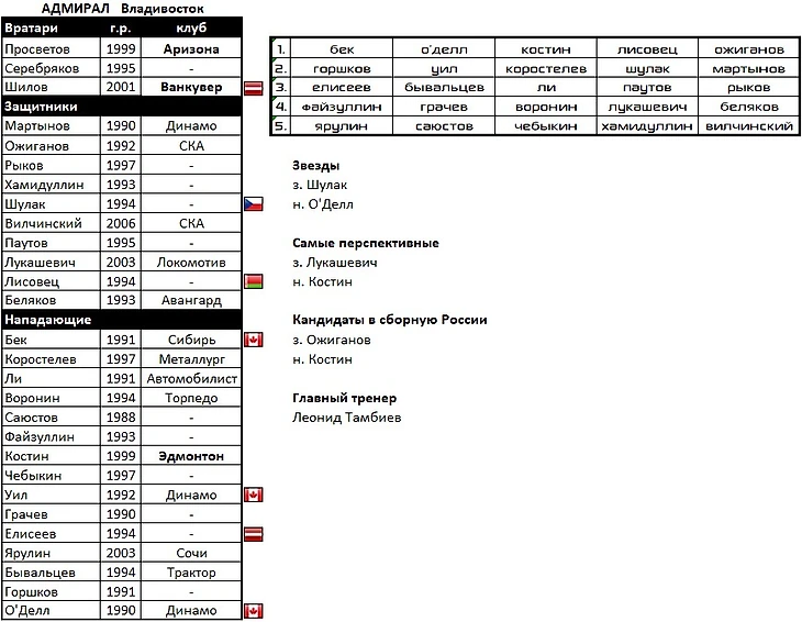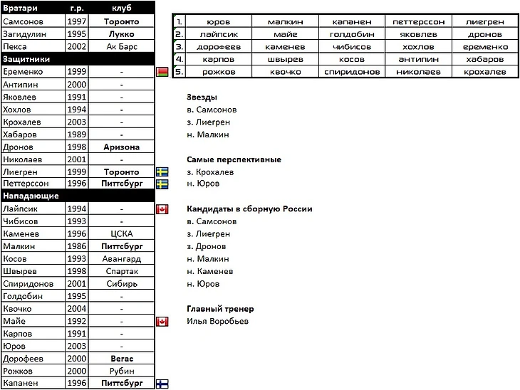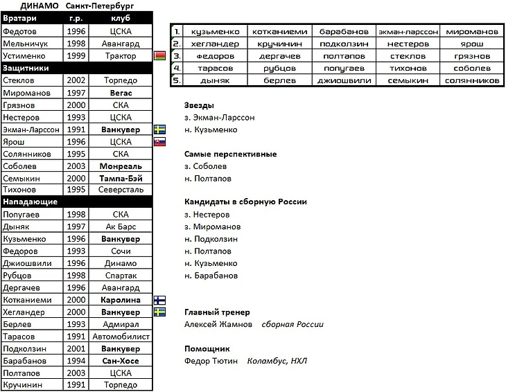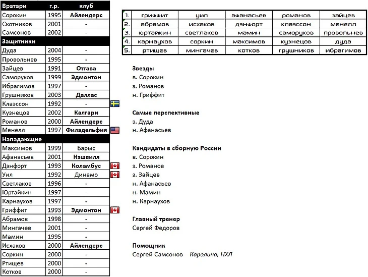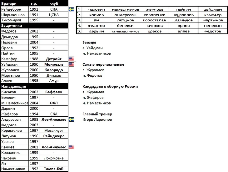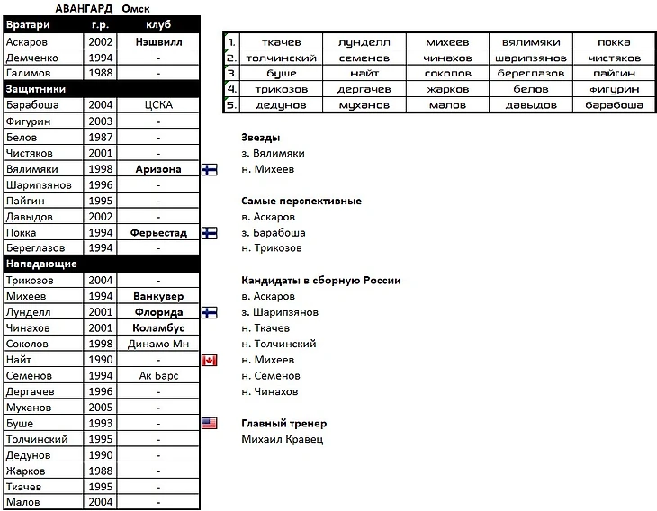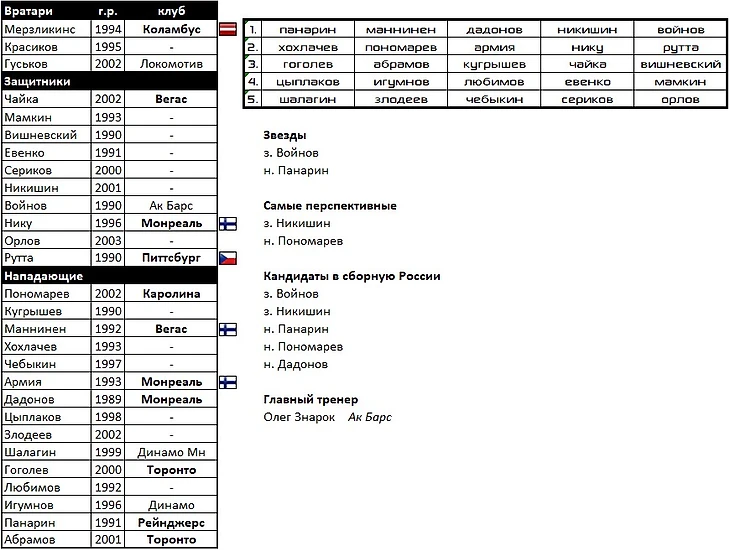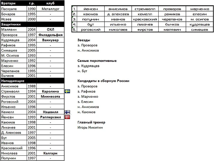 В состав вернулись следующие воспитанники: целая бригада вратарей во главе с Самсоновым, Дронов, Каменев, Косов, Швырев, Спиридонов, Дорофеев, и, конечно же, Малкин. Который подтянул за собой Капанена и Петтерссона. Главной звездой в обороне будет многообещающий Лиегрен.