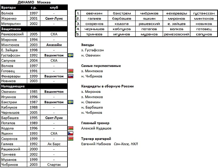 В состав вернулись воспитанники: Жеренко, Минтюков, Сапунов, Ремезовский, Барбашев, Галиев, Чибриков, Овечкин. Обратно вернулись Бэкстрем и Яшкин. Ови захватил с собой домой и парочку добротных защитников - Густафссона и Фехервары.