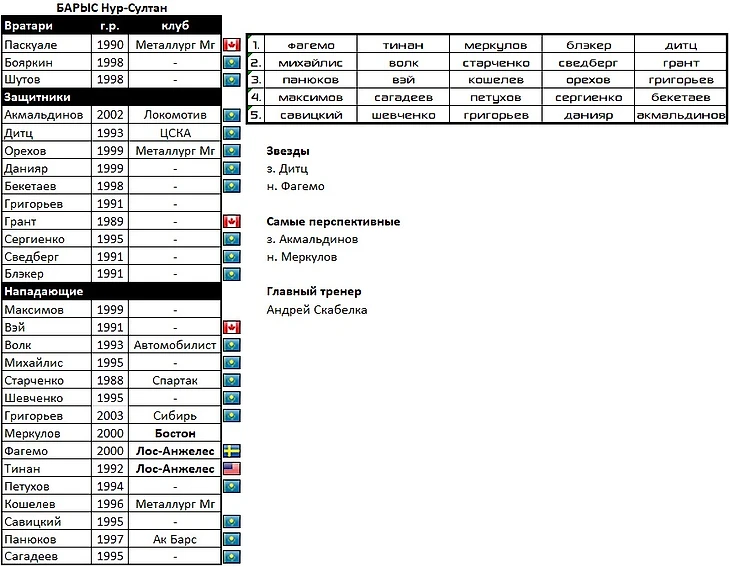 Барыс решил вернуть обратно всех своих блудных сынов: Дитц, Орехов, Блэкер, Волк, Старченко и др. Из Калифорнии на перезагрузку приехал Фагемо и для нового вызова Тинан, которые составят ударную силу. Ворота закроет на замок хорошо знакомый казахским болельщикам Паскуале.