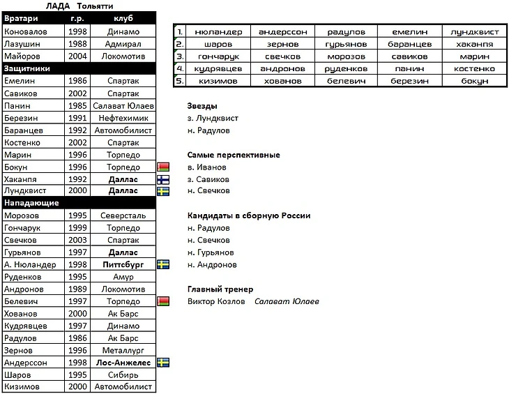 Команда состоит из одних воспитанников, разве что кроме Радулова, Зернова, Шарова, Кудрявцева, Андронова и Белоусова. Но двое последних уже играли в Тольятти. Лундквист, Андерссон и Нюландер-младший возможно именно здесь смогут наконец-то выйти на новый уровень.