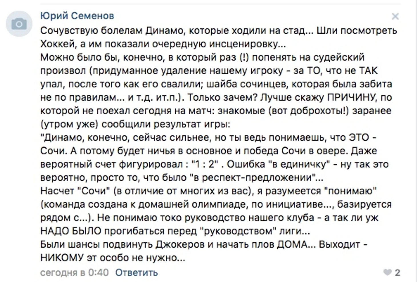 Говорят, что матч между «Динамо» и «Сочи» в КХЛ был договорным. Это так?