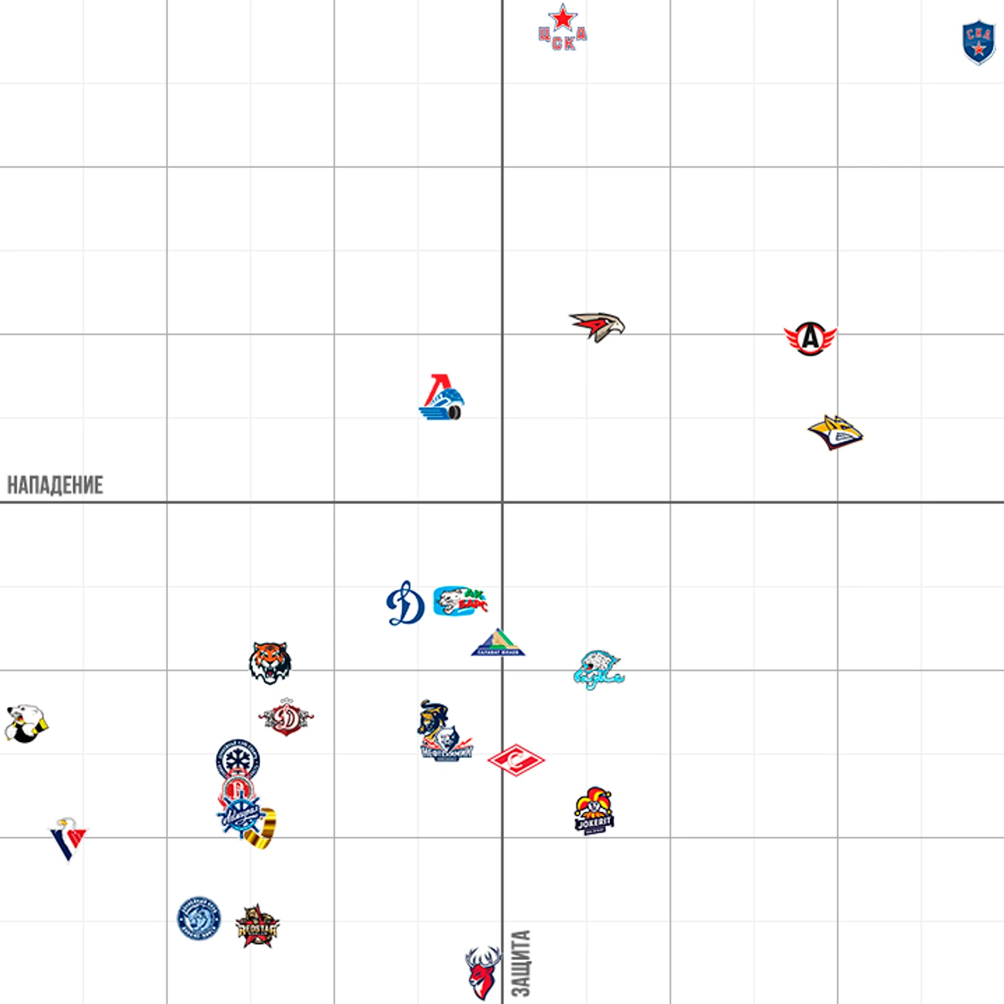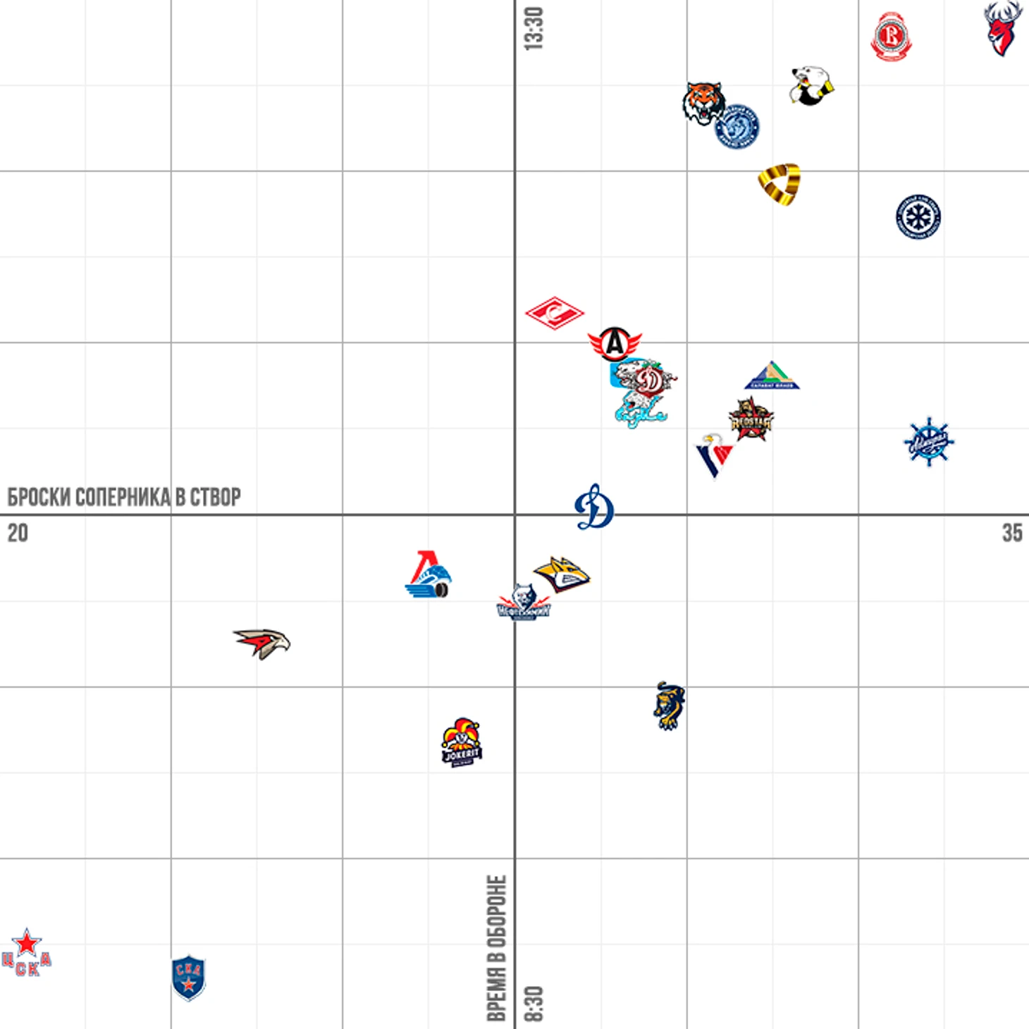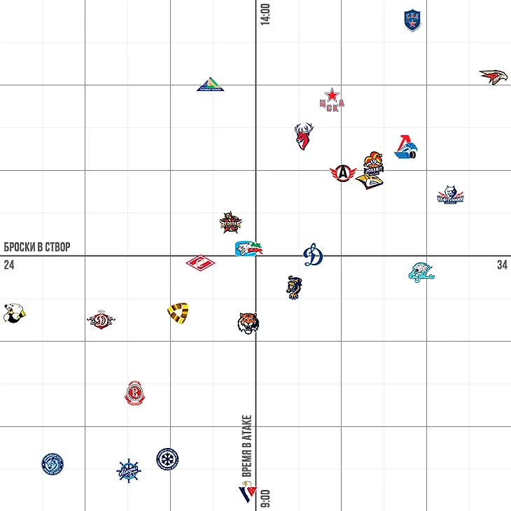 Некоторые данные для наглядности будут отображены на графиках. Здесь по горизонтальной оси – броски в створ, по вертикальной – время в атаке. Соответственно, чем правее находится команда, тем больше она бросает, а чем выше, тем больше проводит времени в атаке.