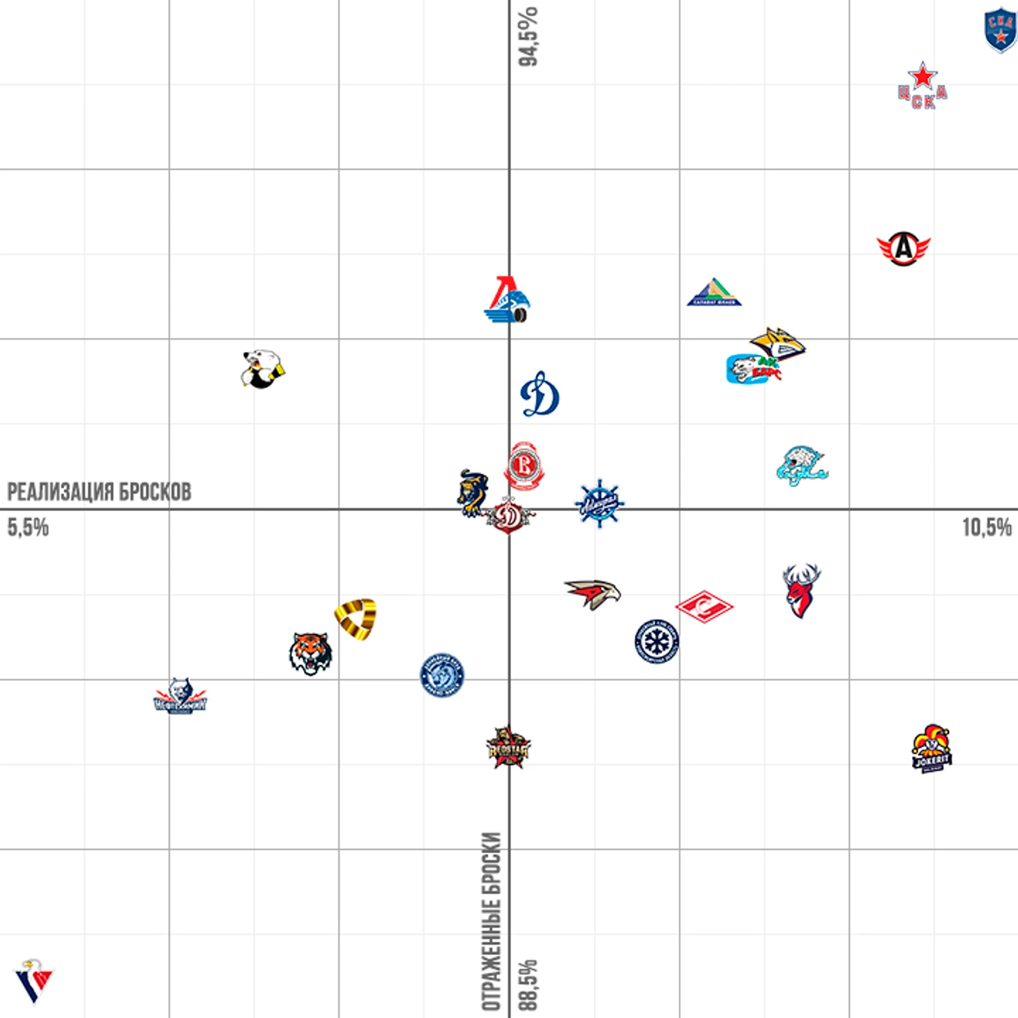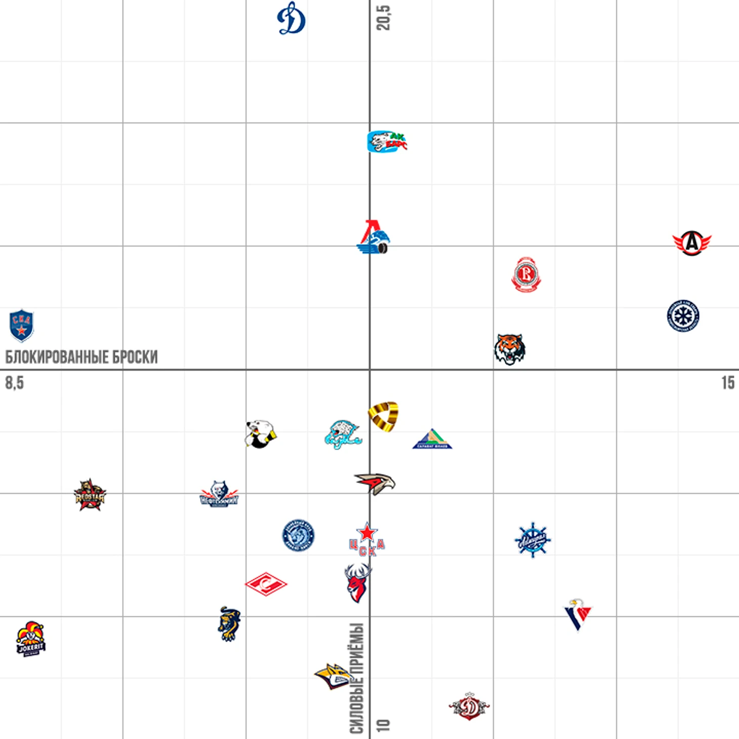 На последнем графике показаны блокированные броски и силовые приёмы. Суммарным лидером является Автомобилист, игроки которого чаще всех попадали под броски соперника. Самым мягким и не самоотверженным является клуб из столицы Финляндии, а уже в первом раунде им играть против Динамо – лидера по силовым приёмам.