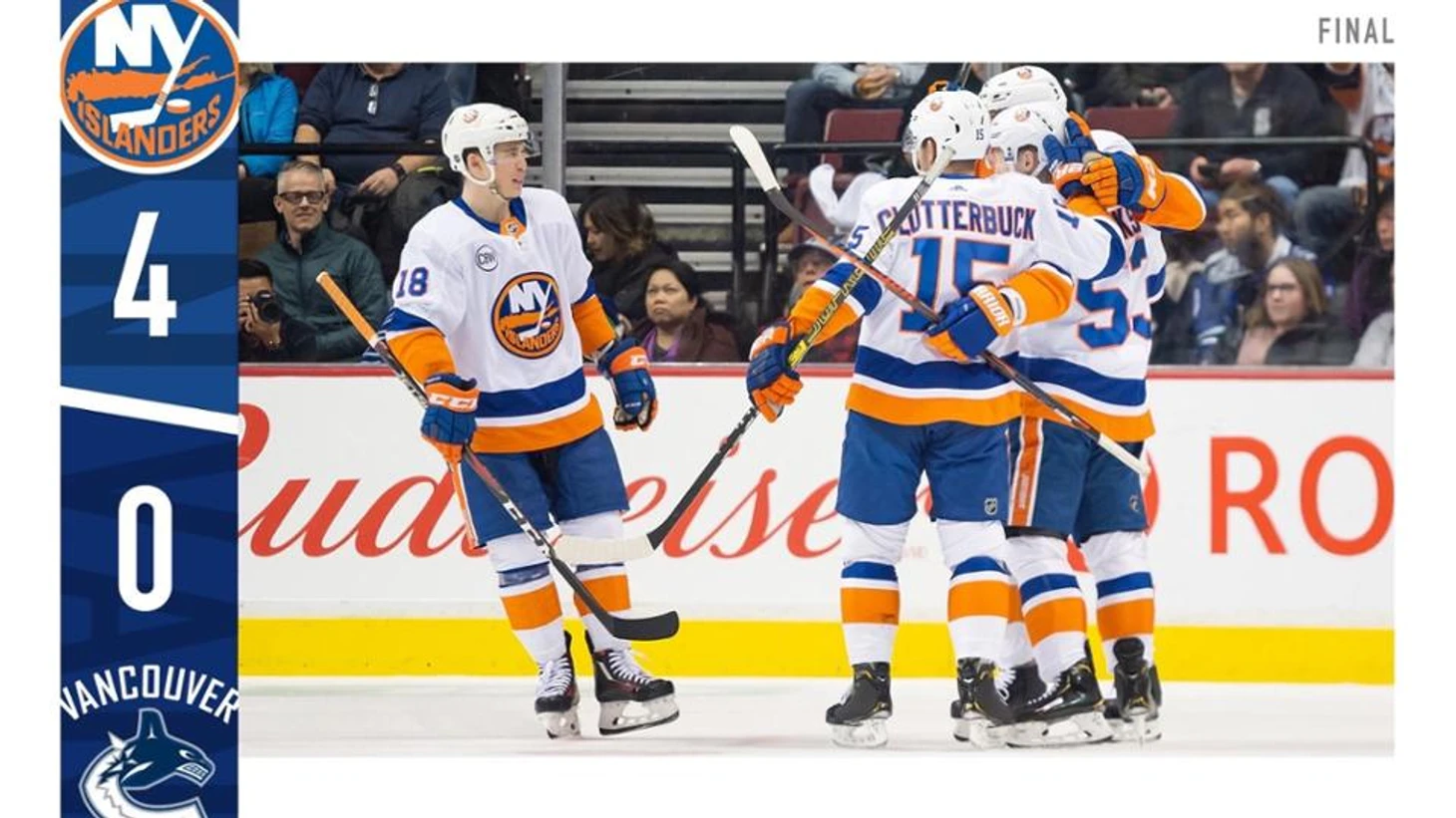 "Ванкувер Кэнакс"-"Нью-Йорк Айлендерс" 0:4.Кейси Сизикас,Райан Пулок,Антуан Бовилье и Кэл Клаттербак принесли победу гостям.Робин Ленер отразил 36 бросков и сыграл 4 сухой матч в сезоне.