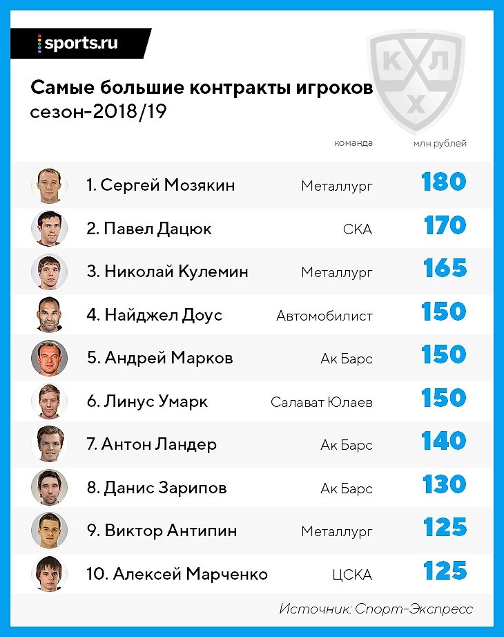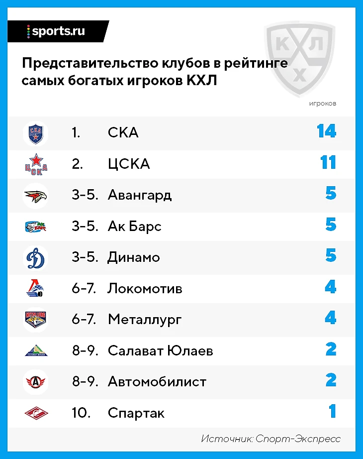 Всего в рейтинге самых богатых игроков этого сезона представители 10 клубов, хотя еще год назад в подобном списке были 12 команд: минус «Северсталь» (Кагарлицкий – в «Динамо»), «Сибирь» (Салак – в «Локомотив») и «Барыс» (Доус – в «Автомобилист»), плюс как раз «Автомобилист» (Доус, Секстон).