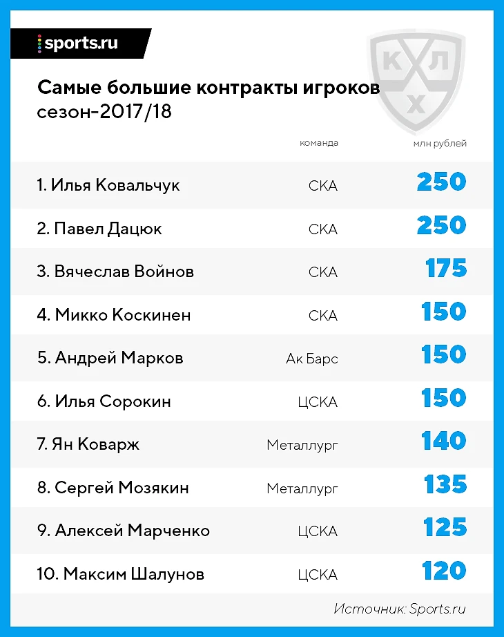 Рейтинг зарплат КХЛ. Больше половины – у СКА и ЦСКА