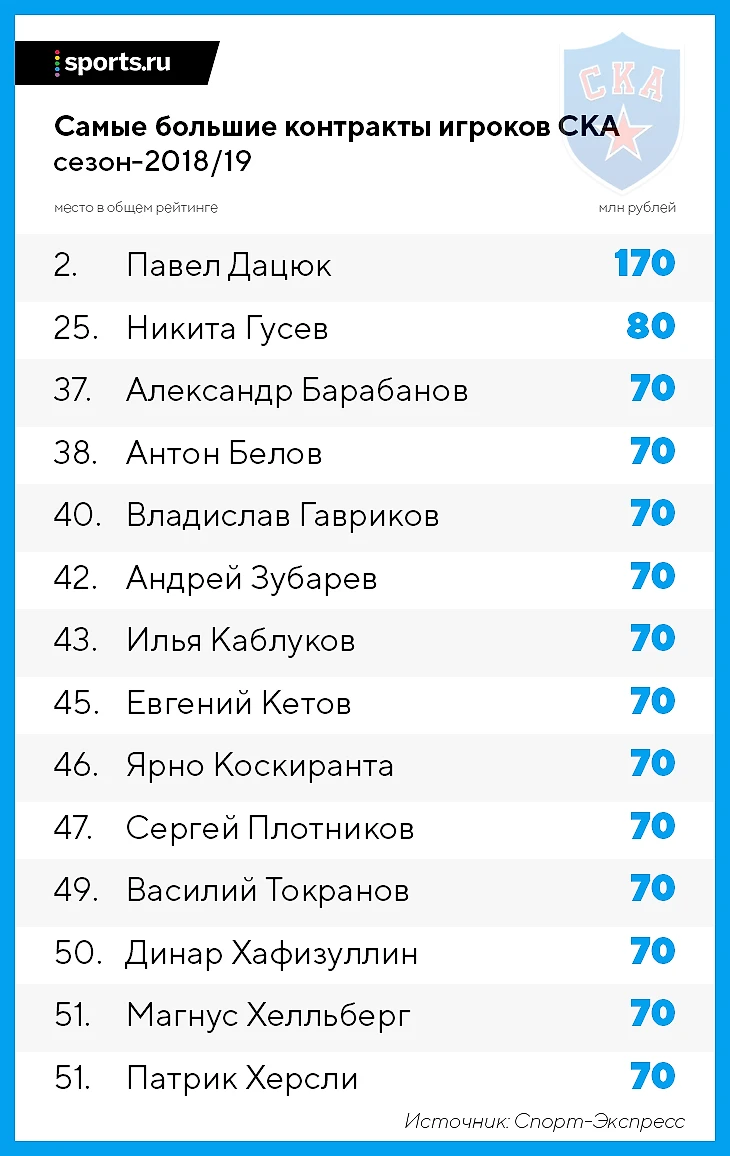 Но теперь игроки СКА массово расположились во второй половине списка «Спорт-Экспресса». При этом у Белова, Зубарева и Плотникова цифры стали заметно меньше, чем год назад.