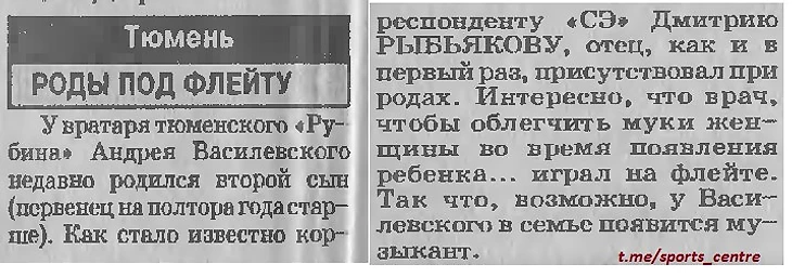 «У вратаря тюменского «Рубина» Андрея Василевского недавно родился второй сын (первенец на полтора года старше). Как стало известно корреспонденту «СЭ» Дмитрию Рыбьякову, отец, как и в первый раз, присутствовал на родах. Интересно, что врач, чтобы облегчить муки женщины во время появления ребенка... играл на флейте. Так что, возможно, у Василевского в семье появится музыкант».