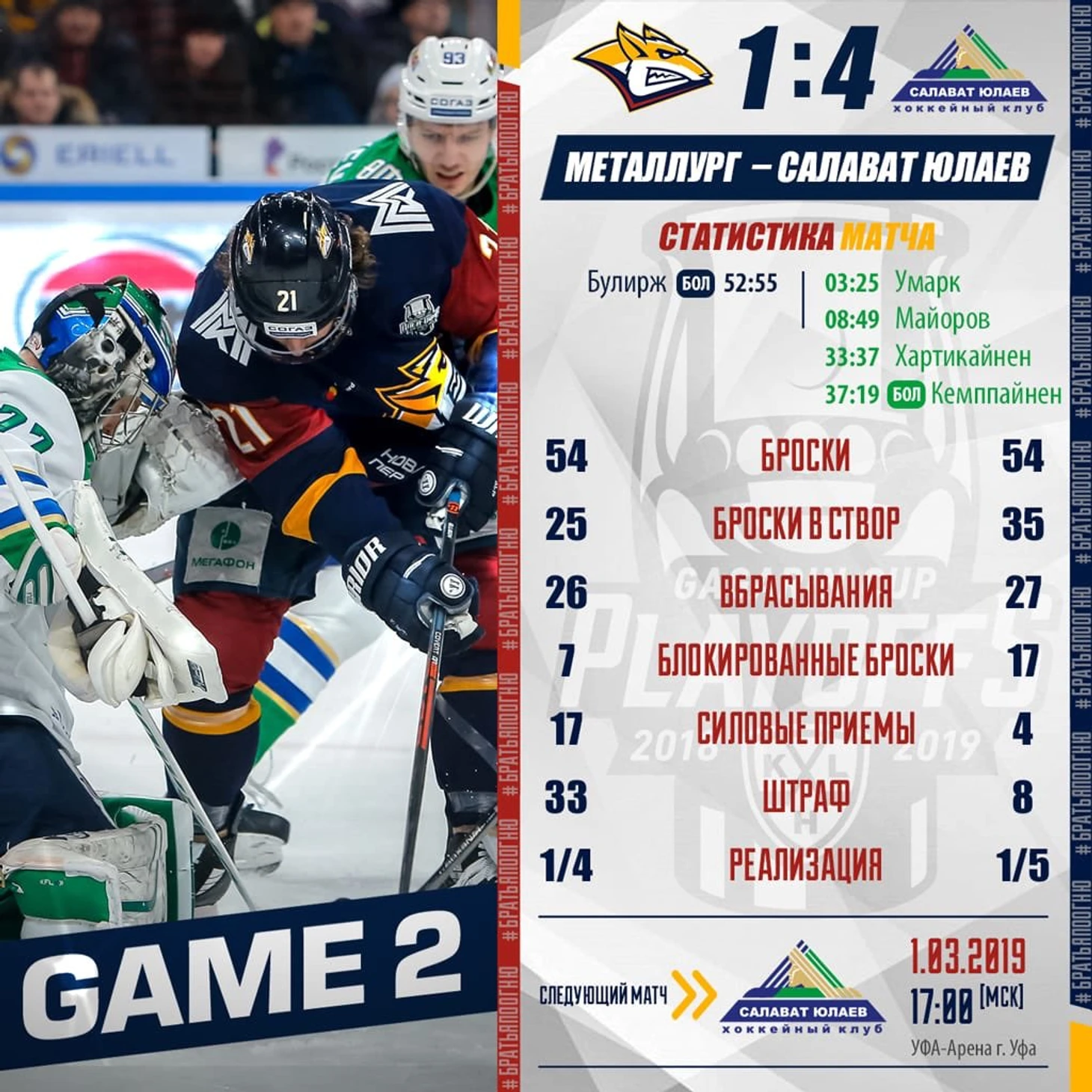 «Металлург» – «Салават Юлаев» – 2:1 ОТ, 1:4