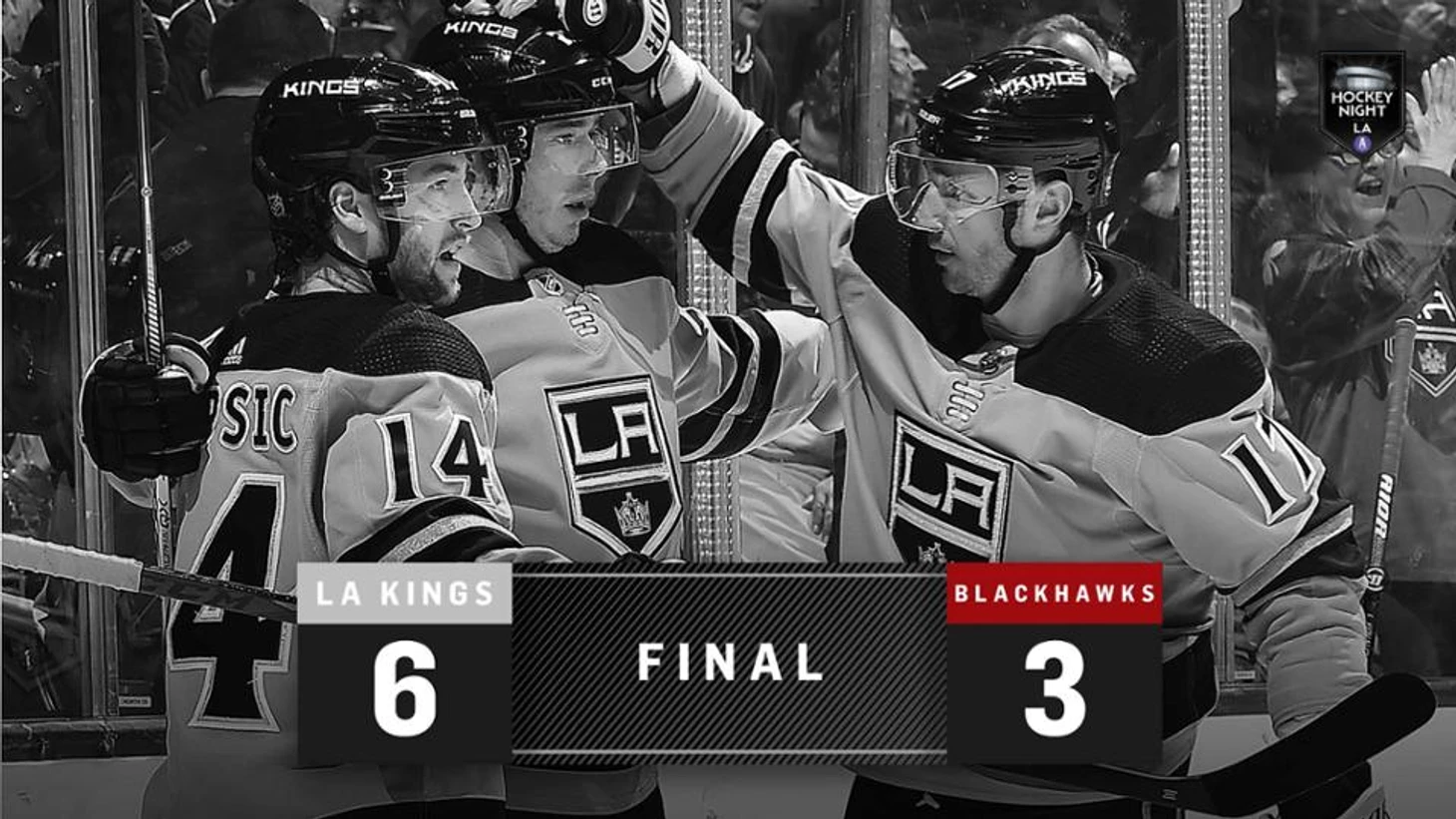 "Лос-Анджелес Кингз"-"Чикаго Блэк Хоукс" 6:3.Гости пропустив 3 шайбы смогли отыграться,но на большее уже не хватило сил.Дастин Браун забросил 2 шайбы,Адриан Кемпе с Бренданом Лейпсиком и Ильёй Ковальчуком набрали по 2 очка (1+1),Джефф Картер отдал 2 результативные передачи,Джонатан Куик отразил 29 бросков.У гостей Брендан Перлини забросил 2 шайбы.