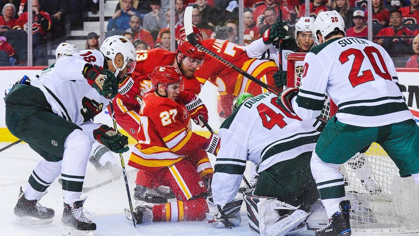 "Калгари Флэймз"-"Миннесота Уайлд" 2:4.Райан Сутер набрал 2 очка (1+1),Джордан Гринвэй отдал 2 результативные передачи,Деван Дубник отразил 35 бросков.Гарнет Хэтауэй получил матч-штраф."Дикари" выиграли 5 матч подряд.