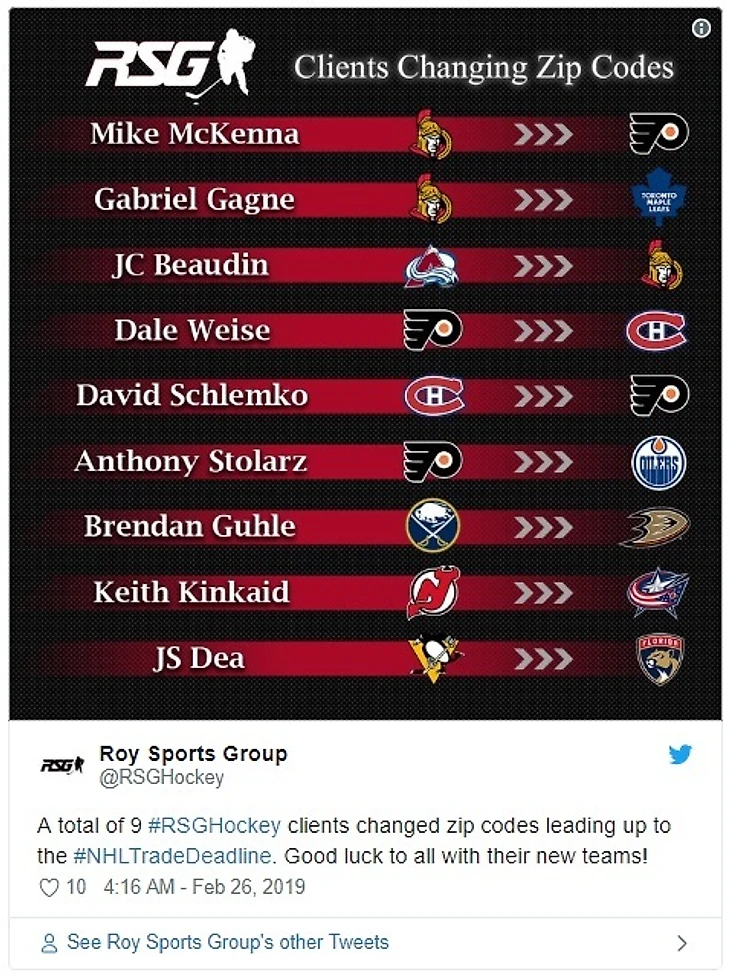 Руа: он спрашивает: «Что генеральный менеджер сказал тебе?» Я все рассказываю своим клиентам. Но пока сам не попадешь в команду, невозможно ничего сказать. Я помню сделки в дедлайн с участием моих клиентов, когда все складывалось удачно. Но есть и другие примеры. К примеру, Дэйл Уис. Он был обменян из «Монреаля» в «Чикаго». «Блэкхокс» надеялись на него в плей-офф. Но главный тренер Джоэл Кеннвилл не смог встроить его в свою систему, так что Дэйл часто оставался в запасе. Летом он выходил на рынок свободных агентов, что ударило по его цене. Невозможно с точностью предсказать, как все сложится.