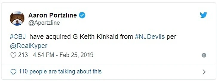 7:54 – журналист Аарон Порцлайн сообщает в Twitter, что «Блю Джекетс» выменяли Кинкейда.
