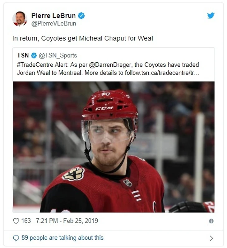 10:21 – журналист Пьер ЛеБрун сообщает, что «Монреаль» обменял Мишеля Шапю, а не Юдона, в «Аризону» на Уила.