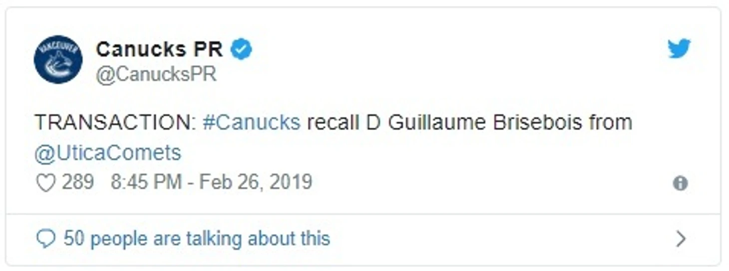 Позже станет известно, что «Ванкувер» обменял защитника Эрика Гадбрэнсона в «Питтсбург» на форварда Тэннера Пирсона. Брисбуа все же был вызван в основу, но это случилось после делайна, так что «Кэнакс» потратили один из четырех своих вызовов.