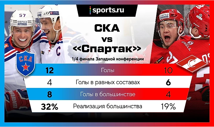 Питер повел в счете, но по содержанию серия застыла в упорном равенстве. У «Спартака» свои фишки (мы писали не раз), у Воробьева – другие: со стороны выглядит так, будто у СКА есть превосходство в контроле, но у москвичей больше контратак с численным преимуществом – 3-в-2, 2-в-1 и даже из ситуации 4-в-3 они выжимают максимум пользы.