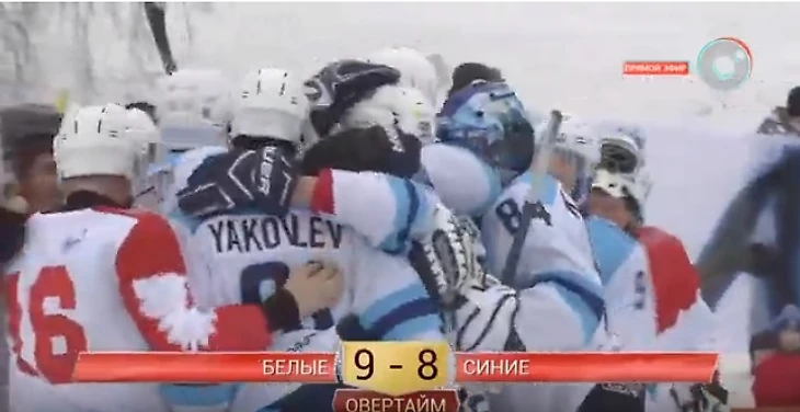Несмотря на то, что "синие" вели после первого периода, во втором тайме "белым" удалось догнать их, подарив зрителям еще кучу голов. Основное время (два тайма по 30 минут) закончилось боевой ничьей- 8:8.