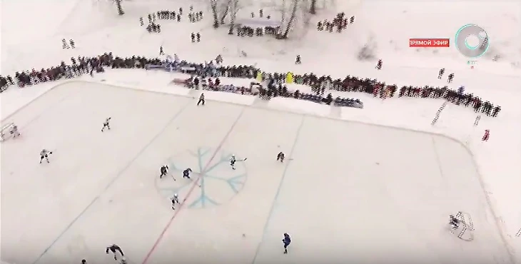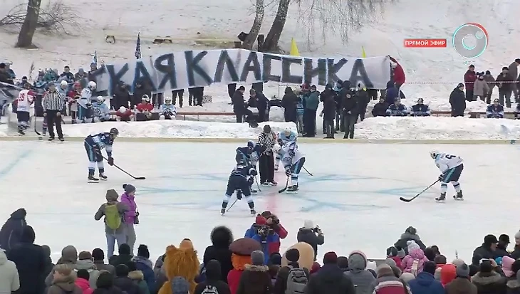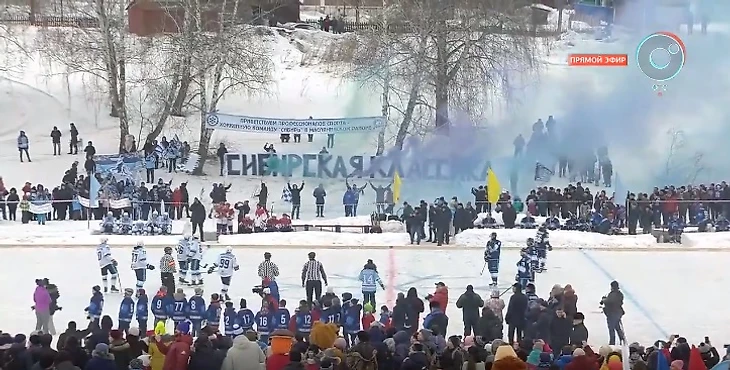 Если закрыть глаза на то, что матч проходил на озере, то все напоминало типичную хоккейную классику под открытым небом. Вокруг льда потрясающая праздничная атмосфера: играла музыка, много народа, везде флаги со снежинкой, работала полевая кухня. А сам матч показывал в прямом эфире областной телеканал. Разве что по периметру отсутствовали трибуны и высокие бортики.