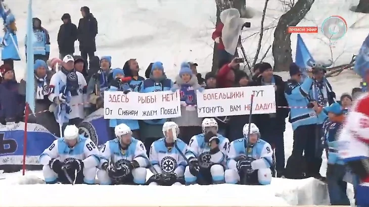 Приезд профессиональной команды для Маслянино - настоящий праздник. К озеру стянулись сотни местных жителей. Не обошлось без визита "городских" - из столицы Сибири примчали преданные болельщики. Они вооружились как на матч КХЛ - с флагами, плакатами, баннерами и барабаном: