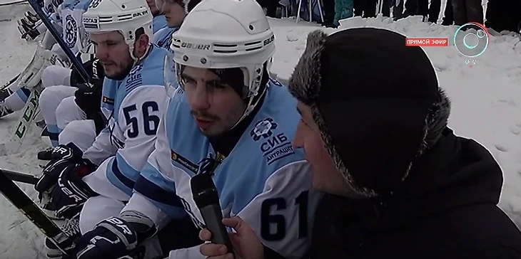 "Прикольно играть на свежем воздухе. Предложение играть на озере было очень неожиданным. Маленько побаивались, что провалимся под лёд. Потом сказали, что его толщина 50 см" - нападающий ХК "Сибирь" Никита Михайлов.