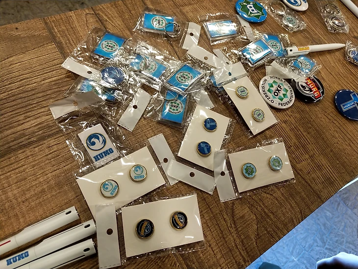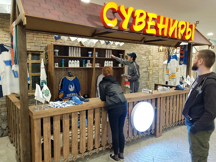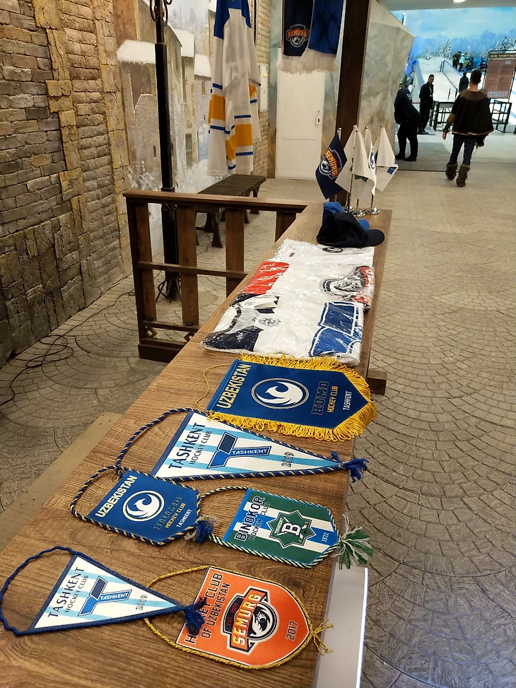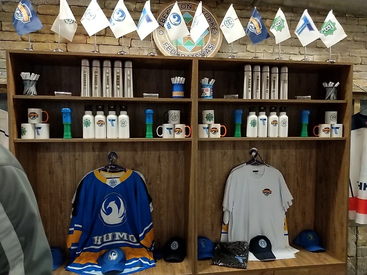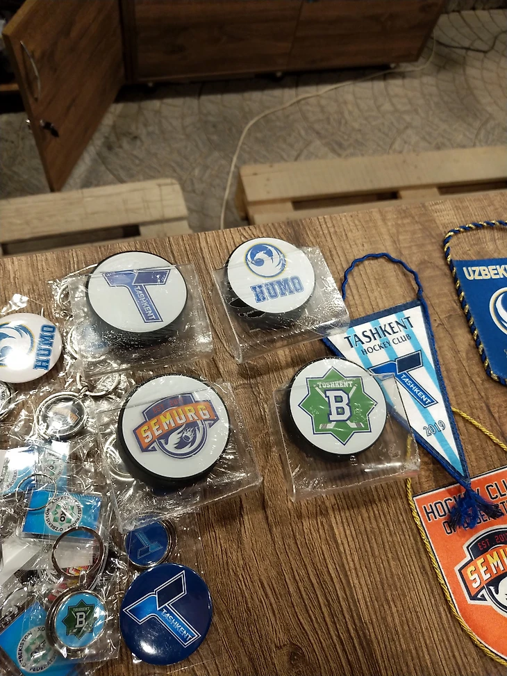 Мерча завались: тут тебе и вымпелы, и значки, и шайбы, и шарфы, и ручки, и термосы. Через пару дней в Самарканде был посещён матч футбольной Суперлиги, который посетило больше 13 тысяч человек, и там не было мерча от слова совсем. А тут такой любительский уровень - и всё есть. Оставил кучу денег.