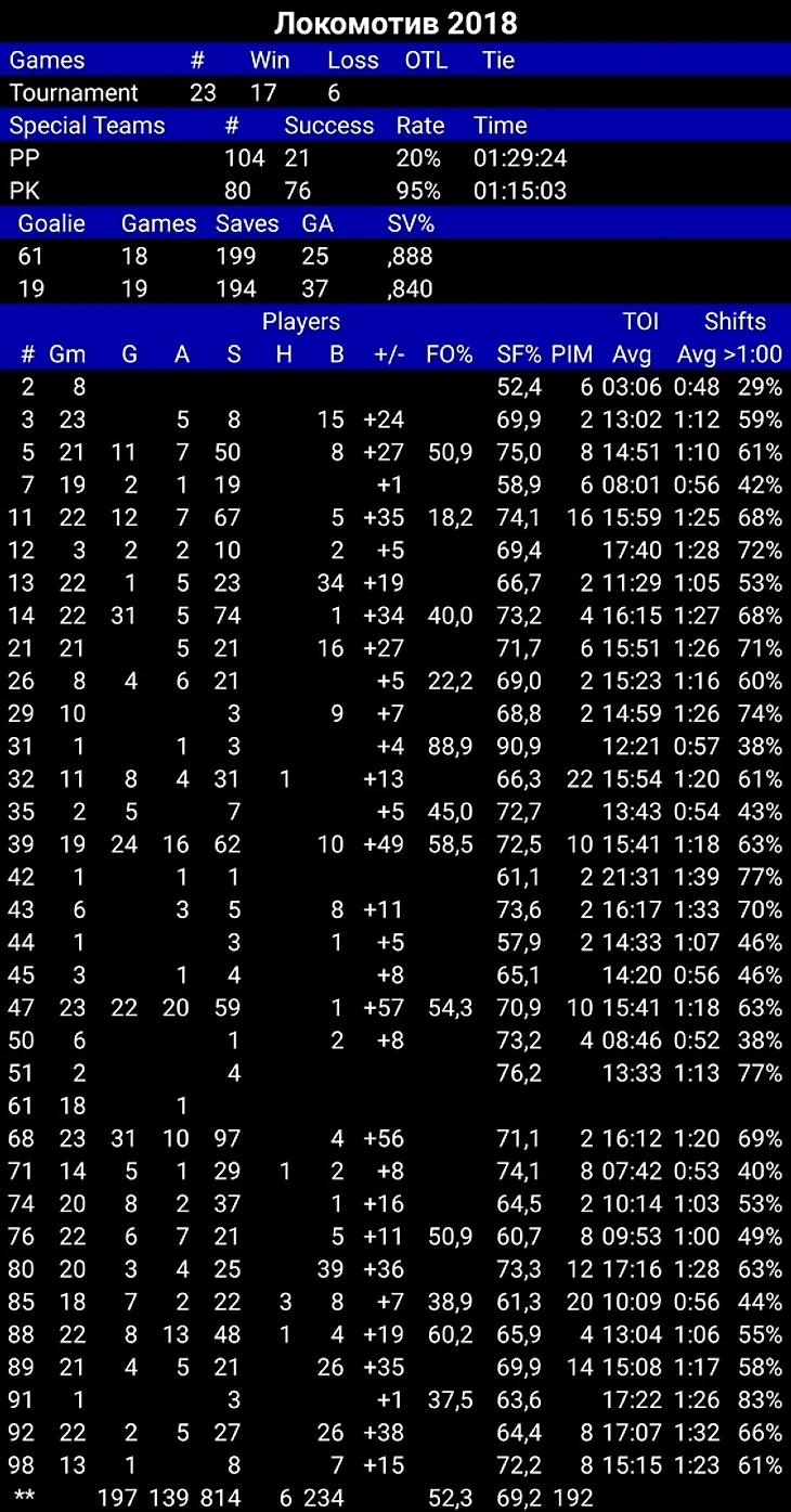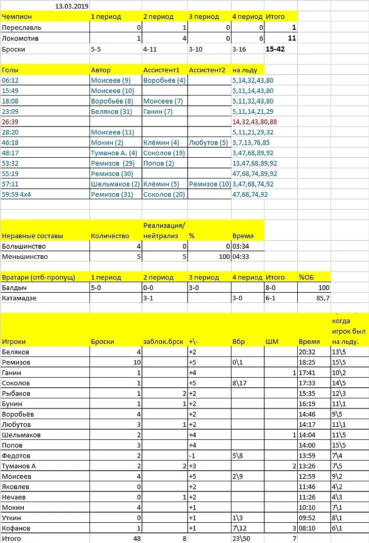 И всё шло замечательно, но тот же Кирилл вновь стал соавтором шайбы в наши ворота, напрочь отказавшись вступать в борьбу, когда был ближе к диску, чем игрок соперника. Как итог – контратака с отличным броском в дальний верхний угол без особых вариантов для Катамадзе. Беляков после этого не присел, зато в принципе перестал меняться – вероятно, было лень бежать до своей скамейки. Дальше он уходил со льда только по свистку. В одном из таких эпизодов (отсутствия Белякова) мы забили ещё раз – первый хет-трик в сезоне оформил Моисеев. Кстати, это произошло вместе с сиреной об окончании первой половины по «чемпионовскому» таймеру, но, как видно на графике, до реальных 30 минут чистого вновь не доиграли прилично.