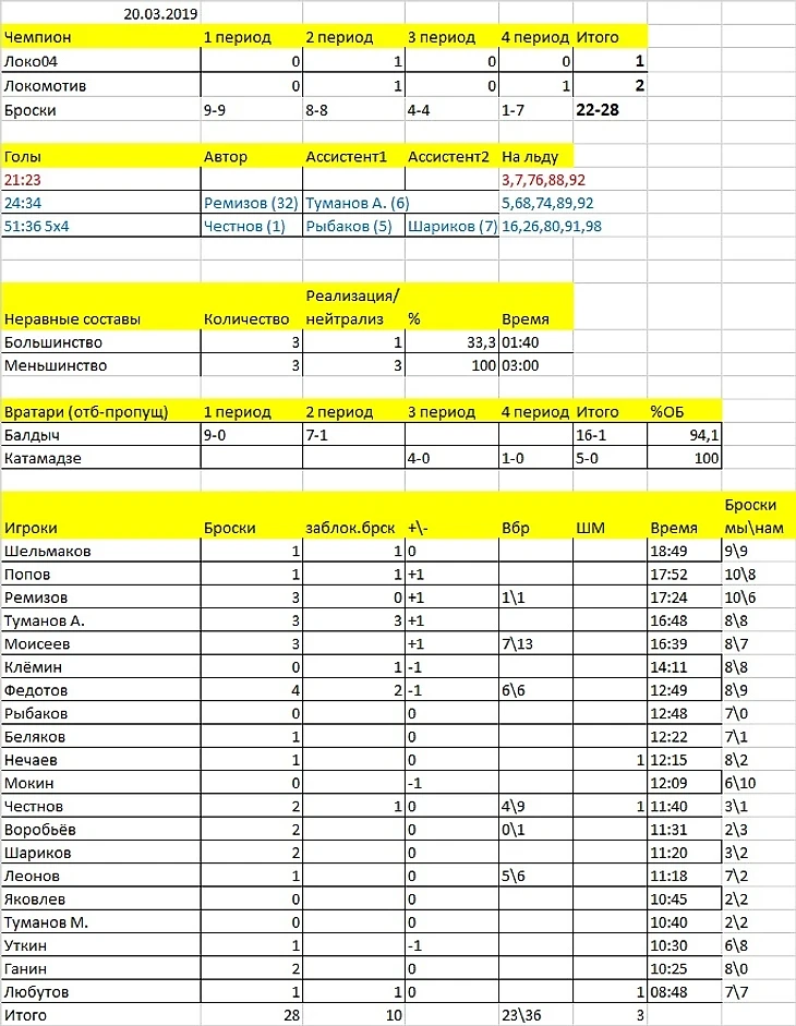 Первый период закончился нулями. Во втором мы отнюдь не сбавили оборотов, и в самом начале создали убойнейший момент – Ремизов промчался через всю зону белых, его бросок был заблокирован, но затем он отличным пасом нашёл Попова на дальней штанге. Артём не попал в пустые. Через пару смен Федотова завалили руками на чужой половине, но судья не обратил на это внимания. Гости убежали в прорыв, при пересечении нашей синей потеряли шайбу. Вова Клёмин оказался на ней первым, завозился, потерял, и форвард «Локо 04» выкатил с угла на пятак, разобрался с Балдычем и открыл счёт в матче.