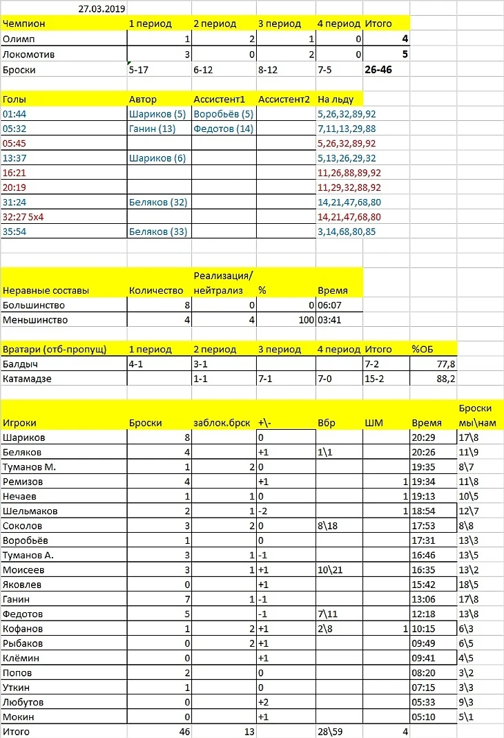 Соколов 4.5. Ваня во втором своём периоде дважды принимал шайбу на себя после дальних бросков защитников «Олимпа». Из достижений – всё. Один совет – ты играешь в маске, поэтому принимать броски лучше всё же лицом к игроку, меньше шансов, что она попадёт в незащищённое место. Это был твой день, но ты сам решил его запороть.