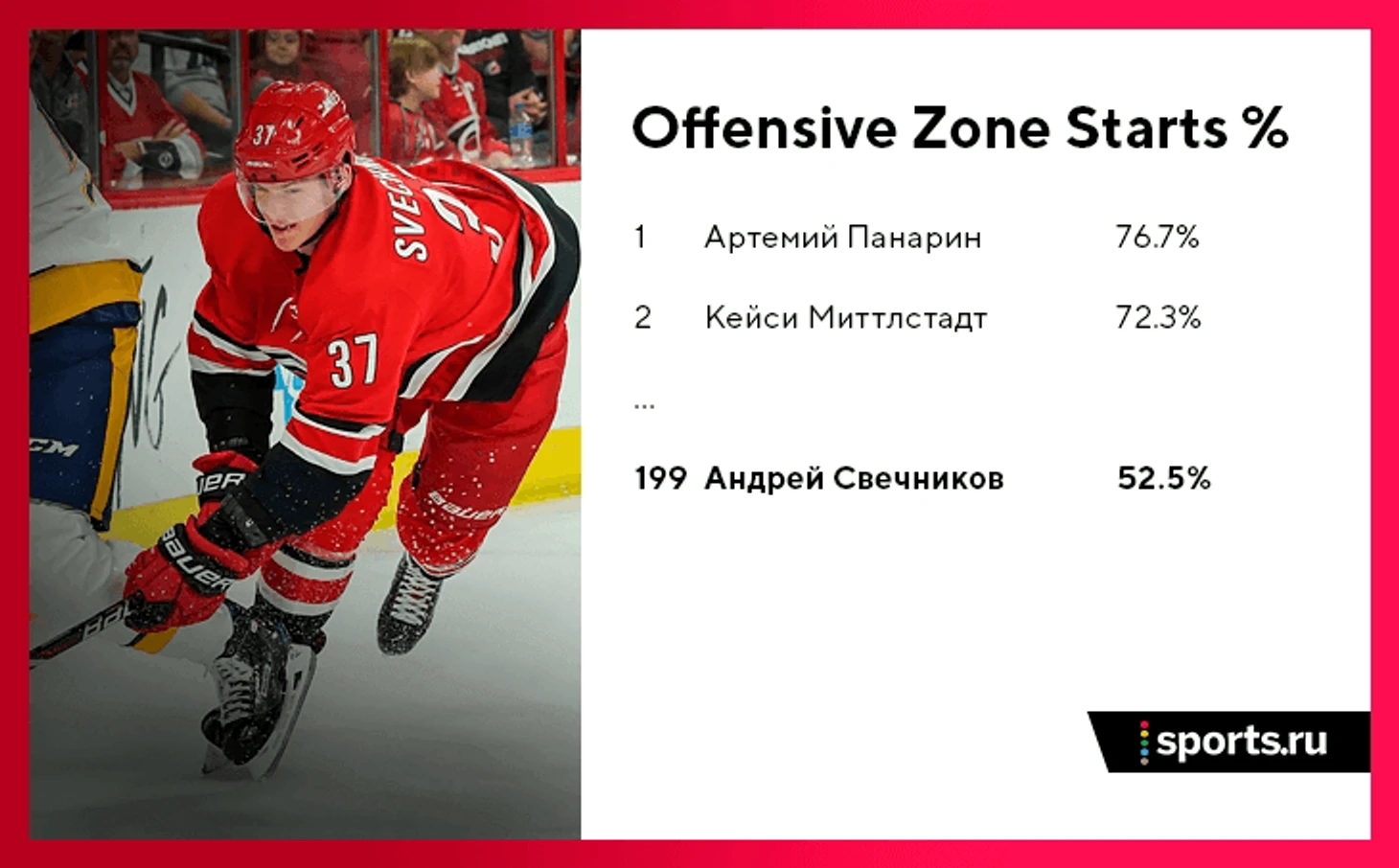 Полезность Свечникова показывает и продвинутая статистика — с 56,8% Corsi For Свечников на 19-м месте в лиге, прямо между Брентом Бернсом и Вильямом Нюландером. При этом Андрей начинает в зоне атаки лишь 52,5% от своих смен, и это только 199-й показатель в лиге.