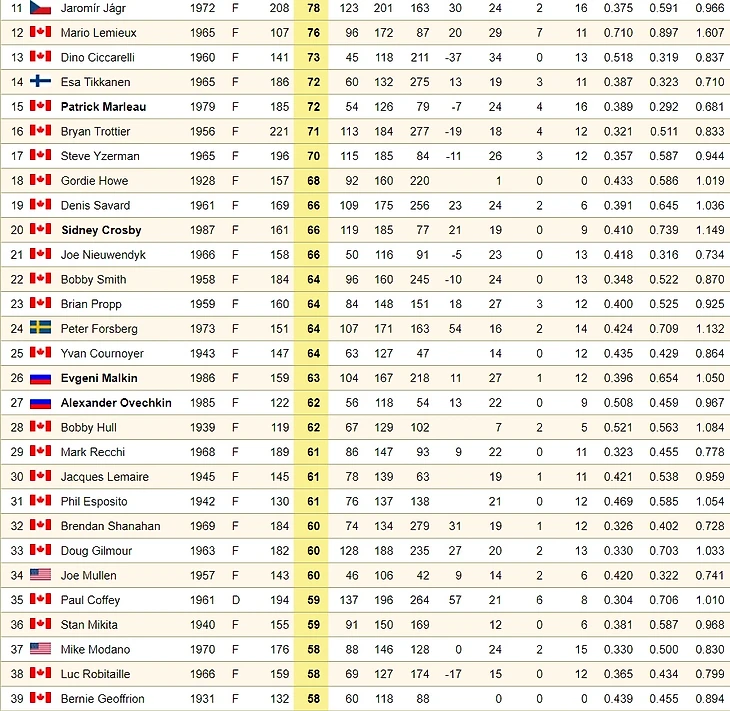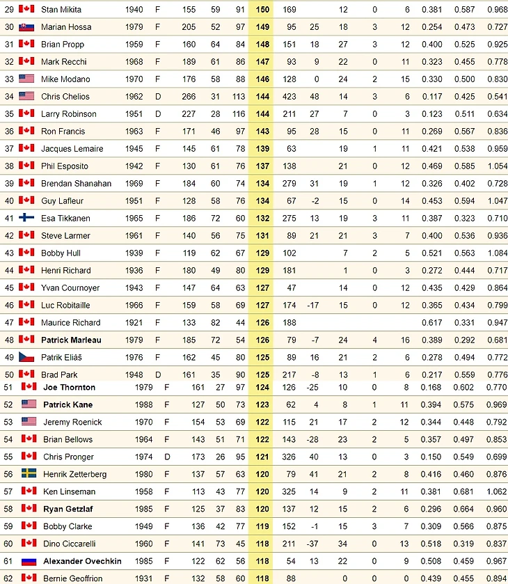 Перед Овечкиным прямо по курсу в пределах 20 очков расположились такие корифеи, как «Ракета» Ришар (126), Бобби Халл (129), Ги Лефлер (134), Фил Эспозито (137), Бобби Кларк (119), Фрэнк Маховлич (118), «Бум-Бум» Джеффрион (118). А также «Карманная Ракета» (129) с рекордными одиннадцатью гайками. При удачном раскладе всю эту легендарную компанию можно обогнать уже в этом году.