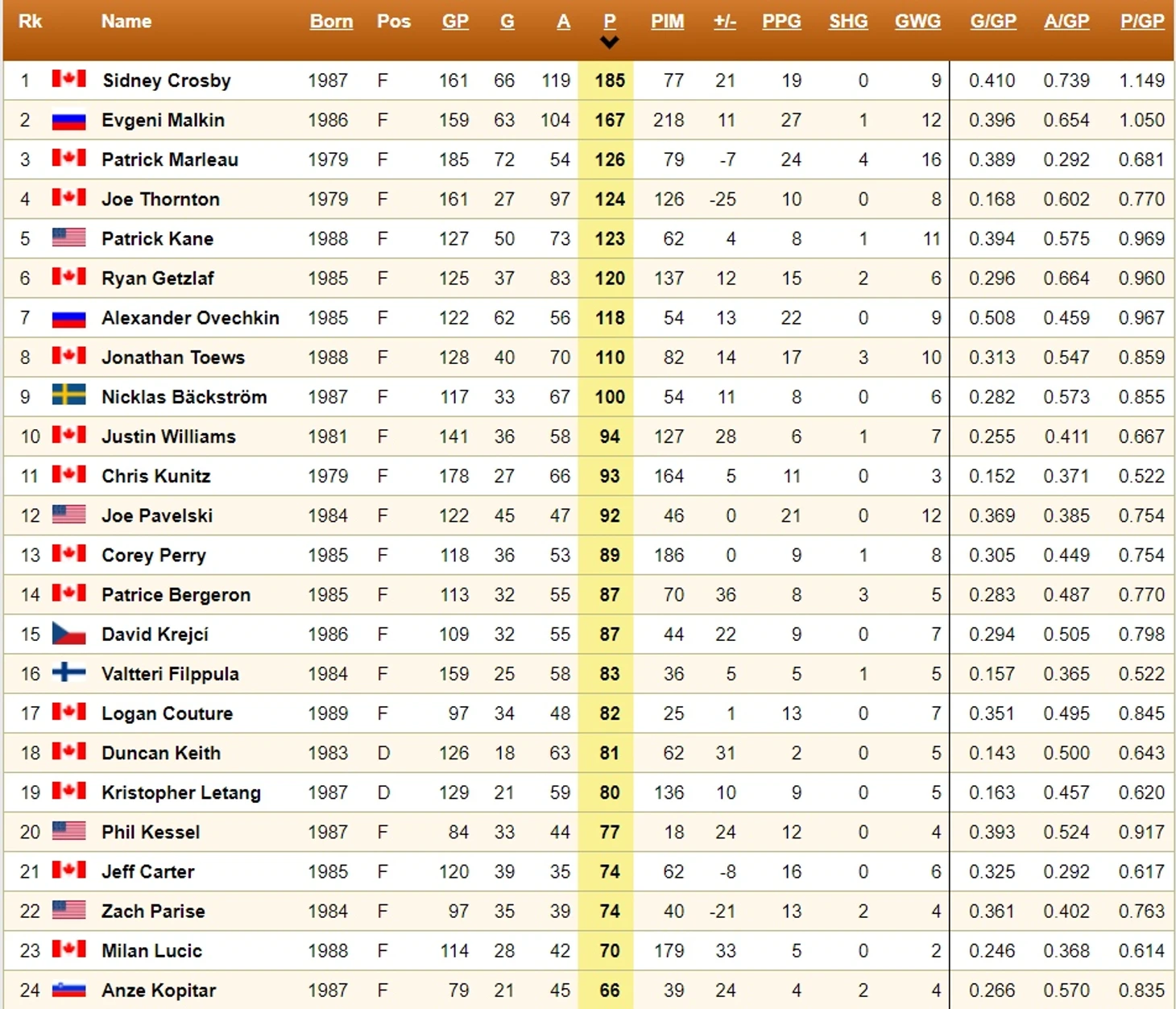 Так или иначе, недалёк тот час, когда Торнтон и Марло повесят коньки на гвоздь, и автоматически перестанут быть конкурентами Овечкина в качестве действующих бомбардиров. В этом есть нечто искусственное. Поэтому взглянем на список лучших бомбардиров XXI века. В верхней части списка изменений немного.На третьем месте появился Хосса, а у Марло и Торнтона убавилось по несколько очков, набранных ещё в 1990-е.
