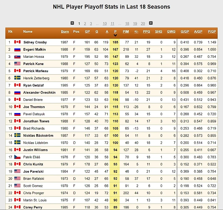 Из ближайших соседей Овечкина только двое принимают участие в ПО. Это два мамонта, два динозавра Патрик Марло и Джо Торнтон. Вполне вероятен вариант, при котором уже на момент окончания второго раунда Овечкин станет третьим бомбардиром ПО среди действующих игроков.