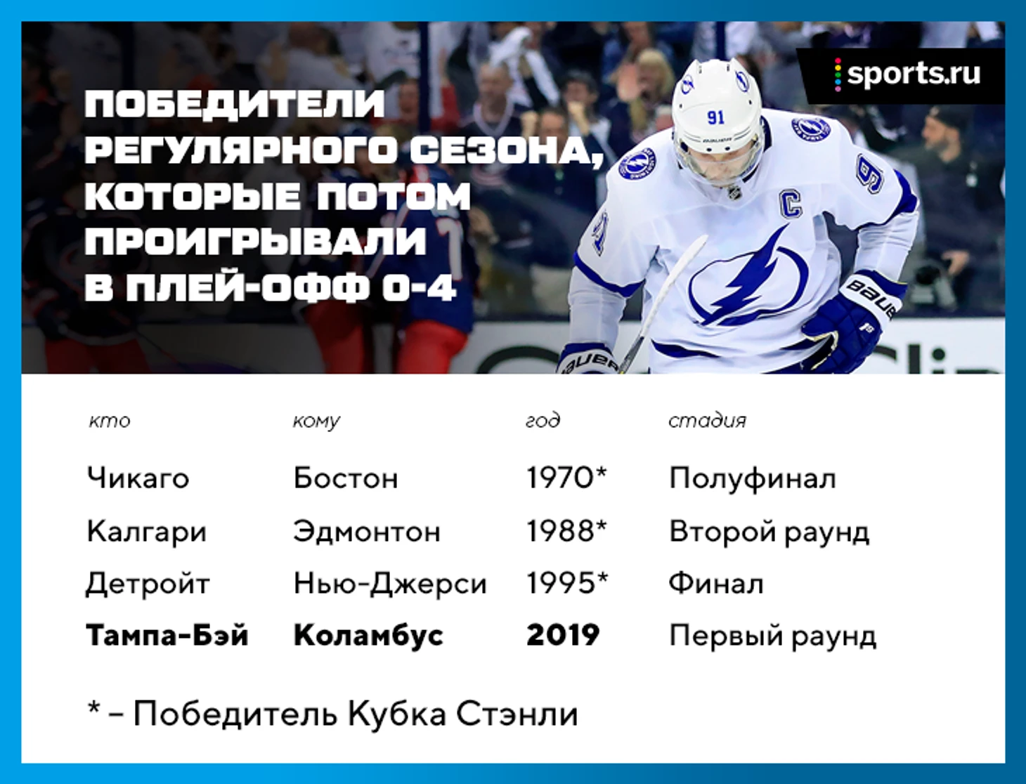 Сезон рекордов рекордом и завершился. «Тампа» не смогла улучшить достижение «Детройта»-1995/96 по количеству побед, но ее результат в плей-офф превзойти будет невозможно. Чемпионы регулярки еще никогда не проигрывали серию со счетом 0-4 в первом раунде, а «Лайтнинг» еще и вылетели раньше всех, кто начинал борьбу за Кубок Стэнли-2019. Даже «Питтсбург» продержался на полчаса дольше, но это так, детали.