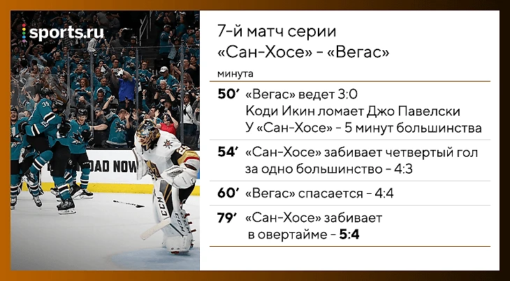 Правда, в первом периоде в подвиг «акул» было сложно поверить – они больше атаковали, но получили гол в середине периода. «Вегас» добавил еще по шайбе во втором и третьем и казалось, что все кончено. Но потом на вбрасывании в зоне «рыцарей» произошло это: