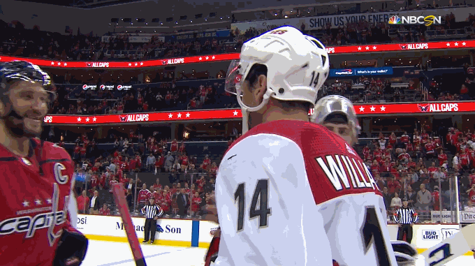 Начиная с третьего периода, «Кэпиталс» перешли на совсем пассивный режим и не особо искали шансов в давлении. Кажется, это заметил Кузнецов: вот он сам идет в форчек и призывает Стивенсона присоединиться – но партнер немного притормаживает.