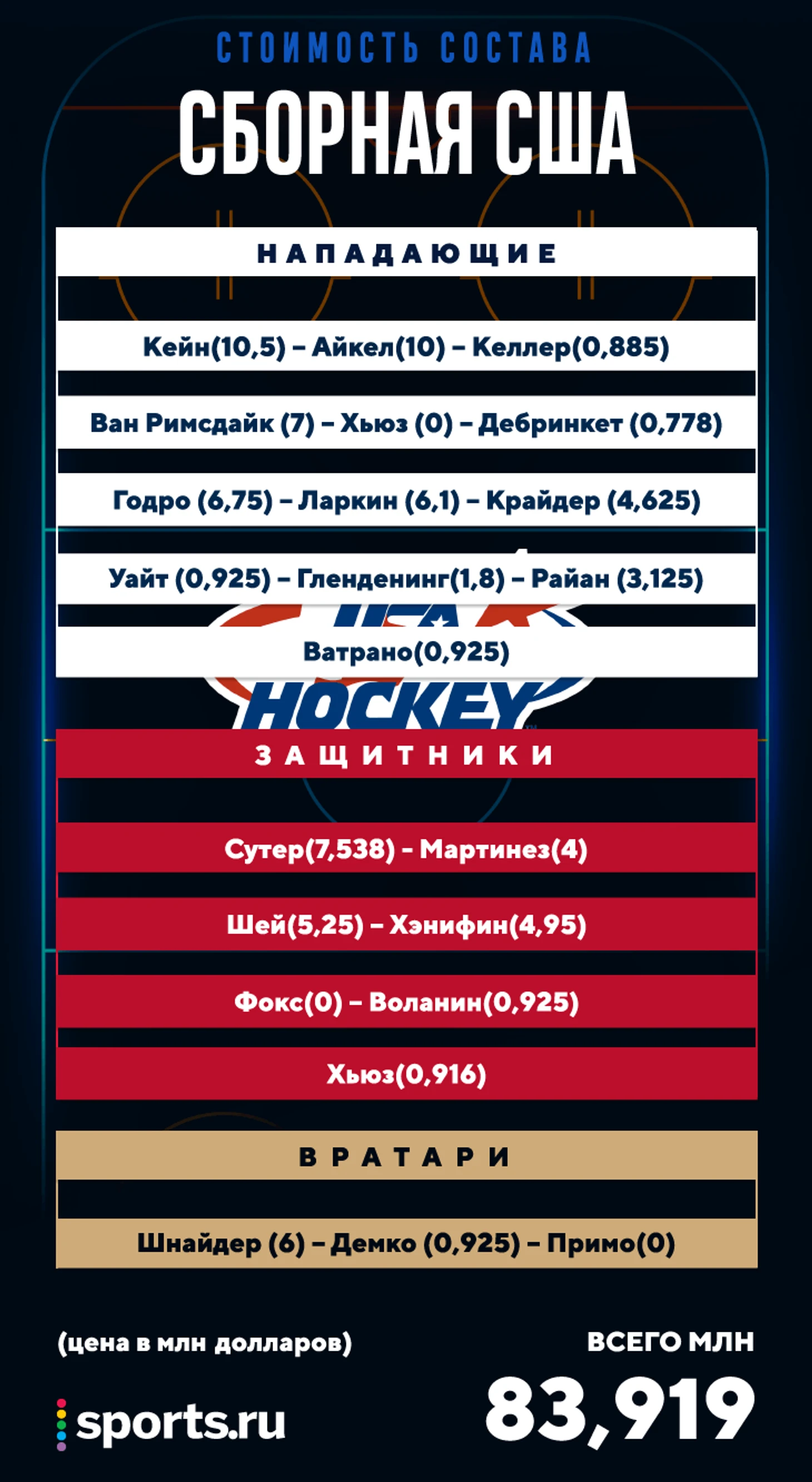 Главный же богач – американская команда. Лучший состав США за последние чемпионаты мира не вместился бы под нынешний потолок зарплат НХЛ. И это при том, что в их составе Джек Хьюз и Адам Фокс, которые, по сути, еще не перешли во взрослый хоккей – их юниорский и студенческий контракты мы не стали считать.