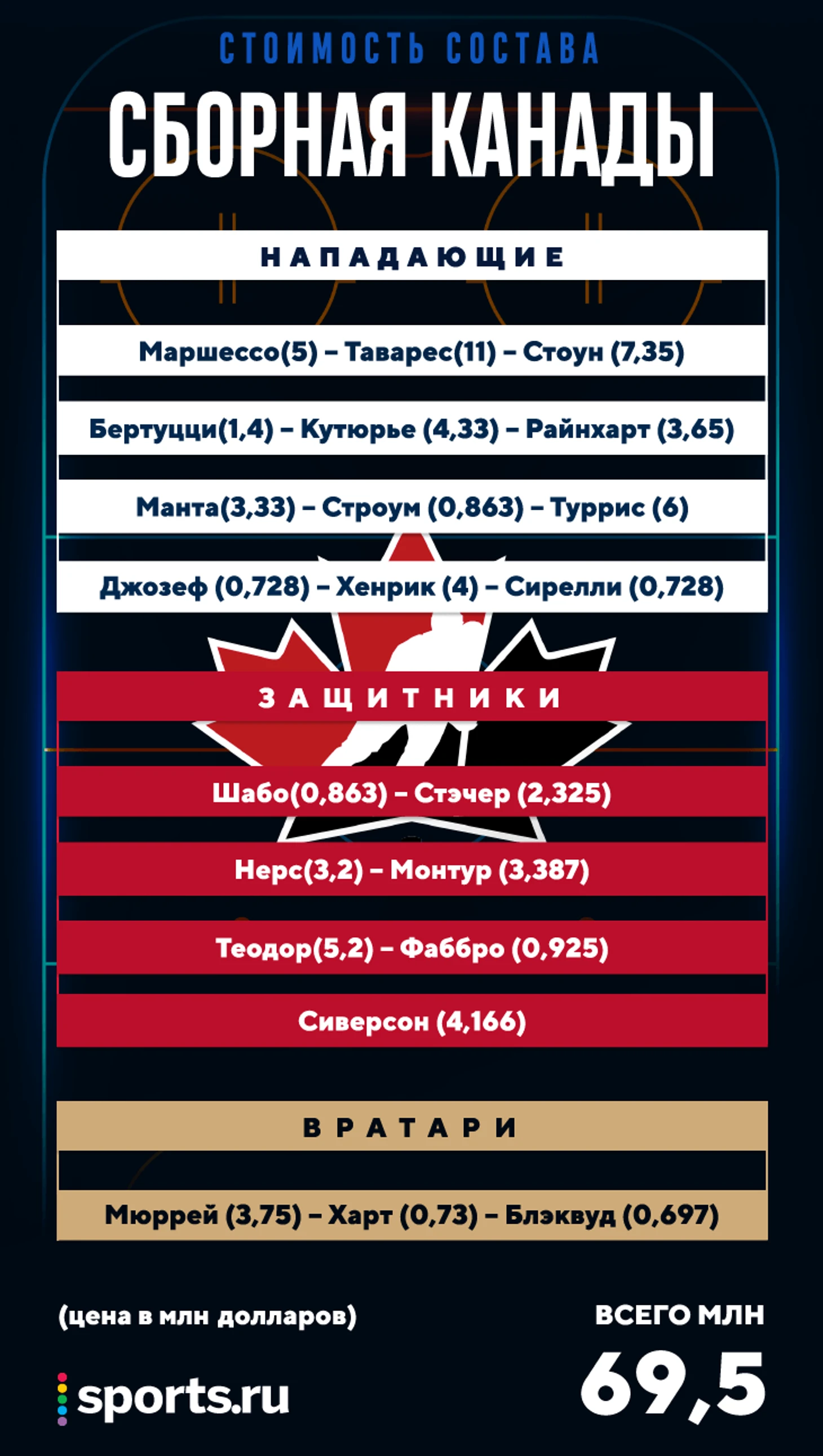 Канада на ЧМ-2019 везет хороший, но не суперзвездный состав. Их ростер на 6 миллионов дешевле российского.