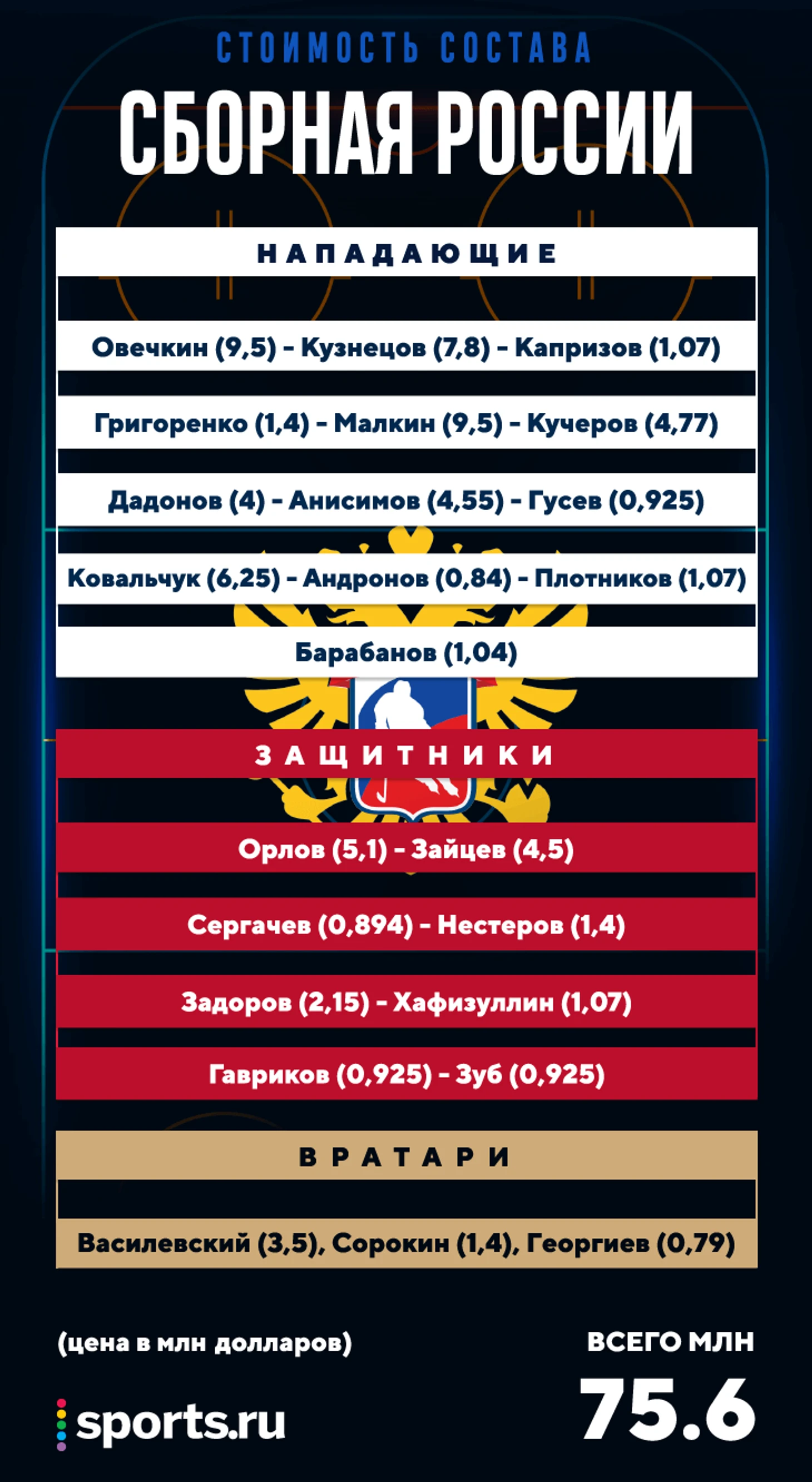 Одна только первая пятерка сборной съедает почти почти 28 миллионов – и это с бюджетным по меркам этой команды контрактом Капризова. Если Илья Воробьев вдруг решит по ходу этого чемпионата выпустить одновременно на лед Овечкина, Малкина и Кучерова с Орловым и Зайцевым в обороне, на арене будут кататься больше 33 миллионов долларов.