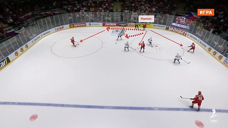 Три варианта передачи под бросок плюс постоянная скрытая угроза: Малкин вылезет сам на пятак и затолкает шайбу в упор. Для защитников это что-то типа русской рулетки.