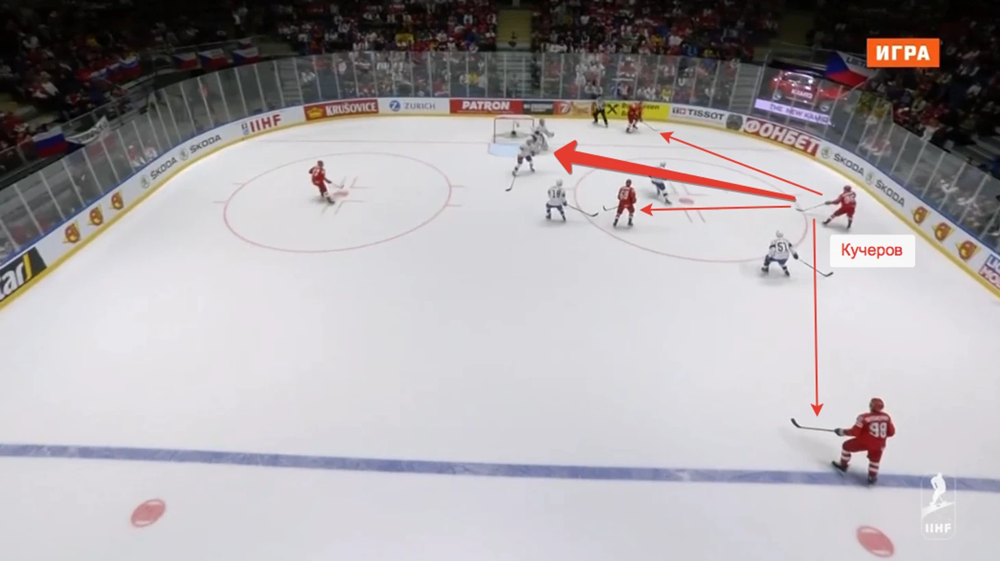 Очень круто, что в этой схеме есть очень классный праворукий нападающий – это позволяет бросать в касание с обоих краев, и это будут очень сложные для вратаря броски. У Гусева точно такой же диапазон вариантов, как у Кучерова; и надо понимать, что любую передачу они исполнят в крюк, шайбу им могут вернуть в касание, и они тут же могут бросить по воротам. Все это они много раз делали по ходу сезона.