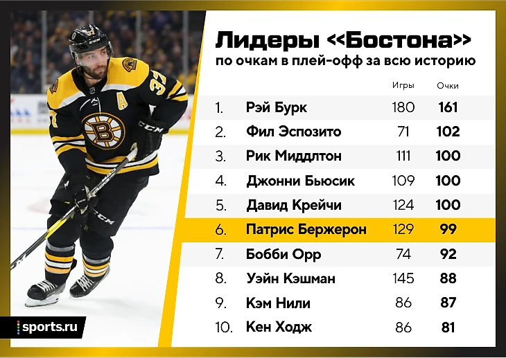 Ни один игрок «Бостона» за последние 20 лет не забросил больше победных шайб, чем Патрис Бержерон. Ни один центральный нападающий «Бостона» за последние 20 лет не выиграл больше вбрасываний, чем Патрис Бержерон. Более того, среди действующих игроков нет ни одного хоккеиста, который играл бы на точке лучше, чем первый центр «Брюинс».