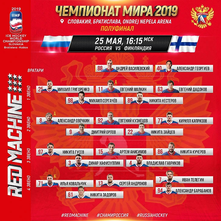 14:45 Всем отличной субботы! Через полтора часа сборная России сыграет против финнов в первом полуфинале ЧМ-2019. Безусловно, мы фавориты в этом противостоянии, но шведы в четвертьфинале тоже так думали, поэтому стоит быть осторожными.