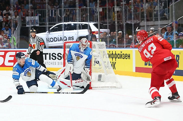 Худший матч Дмитрия на турнире – ему пришлось много играть без шайбы, а в этом он точно не силен. В его смену пришел единственный гол финнов, а до него он как минимум дважды дарил сопернику шайбу. С другой стороны, он быстро понял, что средняя зона забита напрочь и что кроме его проходов надеяться больше не на что – и раз за разом летел в атаку, обыгрывая по несколько соперников.